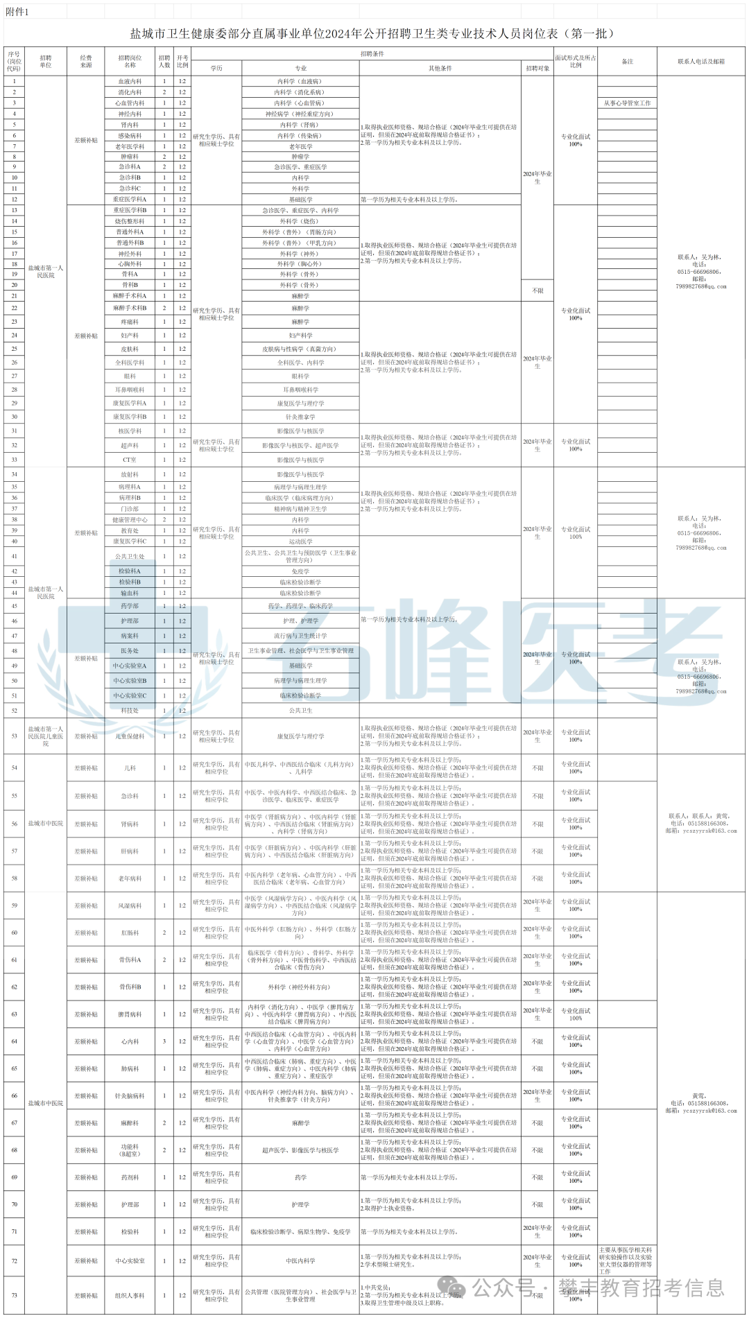 为进一步加强卫生人才队伍建设,更好地选拔优秀适岗人才,优化人员结构,盐城市卫生健康委部分直属事业单位面向社会公开招聘专业技术人员84名。根据《江苏省事业单位公开招聘人员办法》(苏办发﹝2020﹞9号)等规定,现将有关事项公告如下: 一、招聘岗位 本次招聘相关信息在盐城市人力资源和社会保障局网(http://jsychrss.yancheng.gov.cn)、盐城市卫生健康委员会网(http://wsj.yancheng.gov.cn)及各招聘单位网站上发布,具体的招聘单位、招聘岗位、数量、资格条件等详见《盐城市卫生健康委部分直属事业单位面向社会公开招聘卫生类专业技术人员岗位表》(附件1,以下简称《招聘岗位表》)。 二、招聘条件 (一)具有中华人民共和国国籍,拥护中国共产党的领导和社会主义制度,遵守中华人民共和国宪法和法律; (二)遵纪守法,品行端正,团结同志,廉洁奉公,具有良好的职业道德; (三)身心健康,能适应岗位要求; (四)年龄在35周岁及以下(1988年4月5日及以后出生)。对年龄有具体要求的,以《招聘岗位表》中写明的为准,年龄计算方法不变; (五)具备《招聘岗位表》中岗位要求的资格条件: 1.资格条件中的“2024年毕业生”,指在2024年毕业并已取得学历(学位)证书,且现无工作单位的人员。其中,能够提供《毕业生就业推荐表》(原件)的普通高校毕业生,取得学历(学位)证书的日期可放宽至2024年12月31日;国(境)外同期毕业人员,取得学历(学位)证书的日期可适当放宽,但须在2024年12月31日前完成教育部留学服务中心学历认证。 2022年和2023年普通高校毕业生,若仍未落实工作单位,其档案关系仍保留在原毕业学校,或保留在各级毕业生就业主管部门(毕业生就业指导服务中心)、人才交流服务机构和公共就业服务机构的,以及国(境)外同期毕业且已完成学历认证但仍未落实工作单位的人员,可应聘面向2024年毕业生岗位。 参加基层服务项目的人员,如参加服务项目前无工作经历,服务期满且考核合格后2年内的,可应聘面向2024年毕业生岗位。 以普通高校应届毕业生应征入伍服义务兵的人员,退役后1年内,可应聘面向2024年毕业生岗位。 2.《招聘岗位表》中有工作经历要求的,其计算的截止时间为2024年4月30日; (六)具备报考岗位要求的资格条件(详见附件),其中“专业”条件按《江苏省2024年考试录用公务员专业参考目录》设置,专业条件中还包括部分未列入专业参考目录但确有高等学校开设且有事业单位需要的专业。大学本科及以上学历应聘人员须同时具有相应学历和学位证书,且学历学位证书上毕业专业必须与应聘专业相一致。非2024届毕业生报考时应具有学历、学位证书及符合岗位要求的其他条件。 专业名称已经调整的专业,如调整前或调整后的专业符合招聘岗位专业要求,由毕业院校(科研机构)出具调整前后的专业为同一专业或专业课程基本一致的书面证明,视为符合招聘岗位的专业要求。 其中留学人员的毕业专业,由招聘单位根据招聘公告中明确的专业条件、专业参考目录,及其所学课程、研究方向、论文等材料认定是否符合招聘岗位的专业要求。 (七)面向社会招收的普通高校应届毕业生培训对象,住院医师规范化培训合格当年在医疗卫生机构就业的,在招聘中按当年应届毕业生同等对待。对经住培合格的本科学历临床医师,在人员招聘中与临床医学、口腔医学、中医专业学位硕士研究生同等对待(其中住培合格证书中的培训专业原则上应当与招聘岗位的专业或类别要求相一致)。(以下简称“两个同等对待对象”) (八)取得祖国大陆普通高校学历的台湾学生和取得祖国大陆承认学历的其他台湾居民应聘时按国家和江苏省的有关规定执行; (九)有下列情形之一的,不得应聘: 1.现役军人或普通高校在读非2024年毕业生; 2.尚未解除纪律处分或者正在接受纪律审查的人员、刑事处罚期限未满或者涉嫌违法犯罪正在接受调查的人员; 3.应聘人员与事业单位工作人员有夫妻关系、直系血亲关系、三代以内旁系血亲关系、近姻亲及其他须回避的亲属关系的,不得应聘具有直接上下级领导关系的管理岗位,以及《事业单位人事管理回避规定》要求回避的岗位; 4.2024年10月11日前,5年服务期未满的新录用公务员、经公开招聘被江苏省地方各类事业单位聘用且3年服务期未满的在编(在册)人员、有规定(含协议明确)不得解聘离开工作单位(岗位)的人员; 5.国家和省另有规定不得应聘的人员。 三、报名办法 (一)报名时间、方式 报名时间:2024年4月5日9:00-2024年4月11日17:00。 报名方式:应聘人员通过“盐城市卫生健康委员会人事招聘系统”报名,照片上传、资格初审,均通过线上同步进行。报名网址:https://rszp.ycwsjk.cn/zhaopin/index.html。 (二)报名注意事项 1.应聘人员按岗位要求和网上提示,如实填写有关信息,并上传所需材料:①《盐城市卫生健康委部分直属事业单位面向社会公开招聘卫生类专业技术人员报名表》(附件2);②本人近期免冠正面二寸(35×45毫米)证件照,jpg格式,大小为20kb以下;③身份证扫描件;④学历、学位证书、专业方向证明等扫描件,其中未取得毕业证书的2024年毕业生须提供所在院校出具的省教育厅统一印制的《毕业生双向选择就业推荐表》;2022年、2023年毕业生应聘面向2024年毕业生岗位的还需提供原始的空白《毕业生就业协议书》、《“2024年毕业生”身份承诺书》(附件3);⑤其他材料:岗位