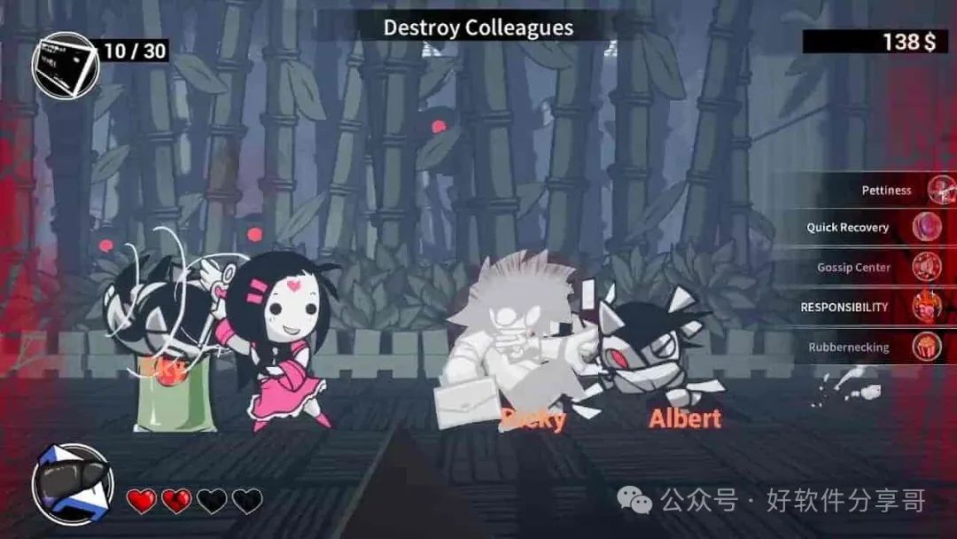 第一印象:风格化的 Roguelite 动作游戏。良好的艺术设计。翻译有点欠缺。整体需要打磨。一款幽默的横向卷轴游戏,将格斗游戏玩法与 Roguelite 和 RPG 元素相结合。感觉就像是对日本工薪族陈词滥调以及企业界的糟糕和奇怪元素的讽刺。友谊带来爱、勇气和希望即使在黑暗和绝望中,你也会遇到像早晨的阳光一样闪耀的伙伴。 《即刻离职》清爽的打击感加上ROGUE LIKE的设计,将怀旧街机精神与现代游戏元素巧妙地结合在一起。角色之间的互动充满幽默感,让整个游戏充满了乐趣。尤其是游戏对“辞职”主题的处理非常有创意,将日常工作和生活中的压力转化为游戏中的战斗挑战。这不仅令人耳目一新,还引发了玩家对真实工作环境的深刻理解。分层思考。游戏中的玩法参考了格斗游戏中常见的Combo概念。