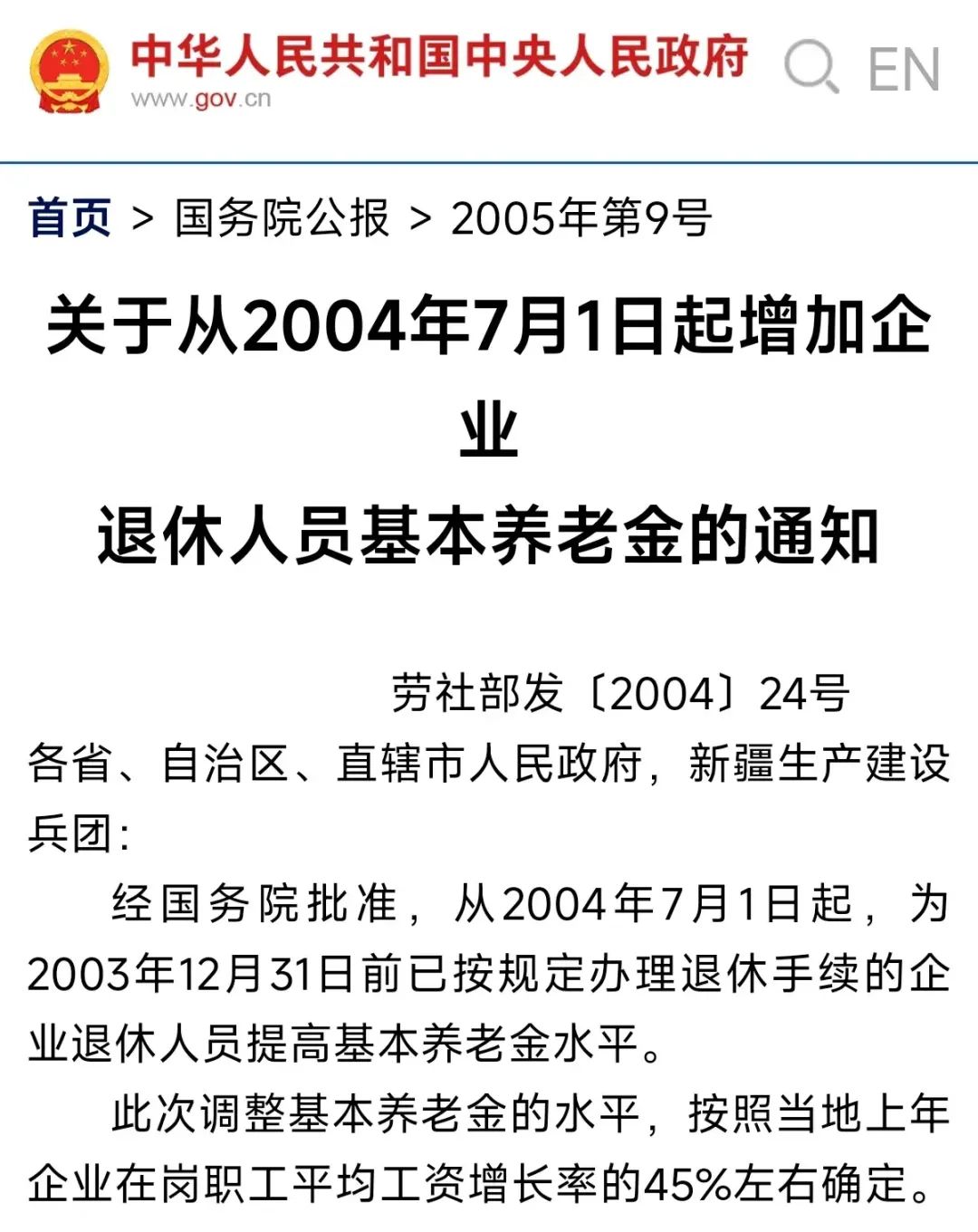 根据后期的统计数字,2004年的时候企业退休人员的基本养老金水平是714元,但是2005年就涨到了883元,所以增长比例是23.7%了。实际上,国家类似养老金调整的通知也有2004年的。暖心在国务院网站上找到了通知的原文,总体调整水平是按照当地企业在岗职工工资平均增长率的45%确定,比起后续的三年都低。