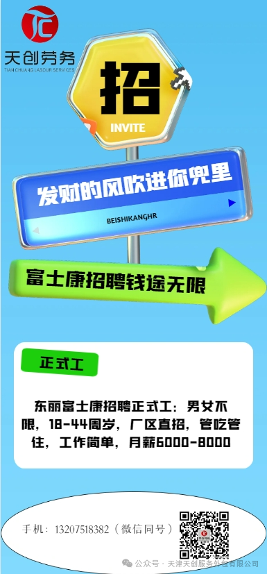 发财的风吹进你的兜里,天津富士康招聘正式工,管吃住,月薪6000~8000