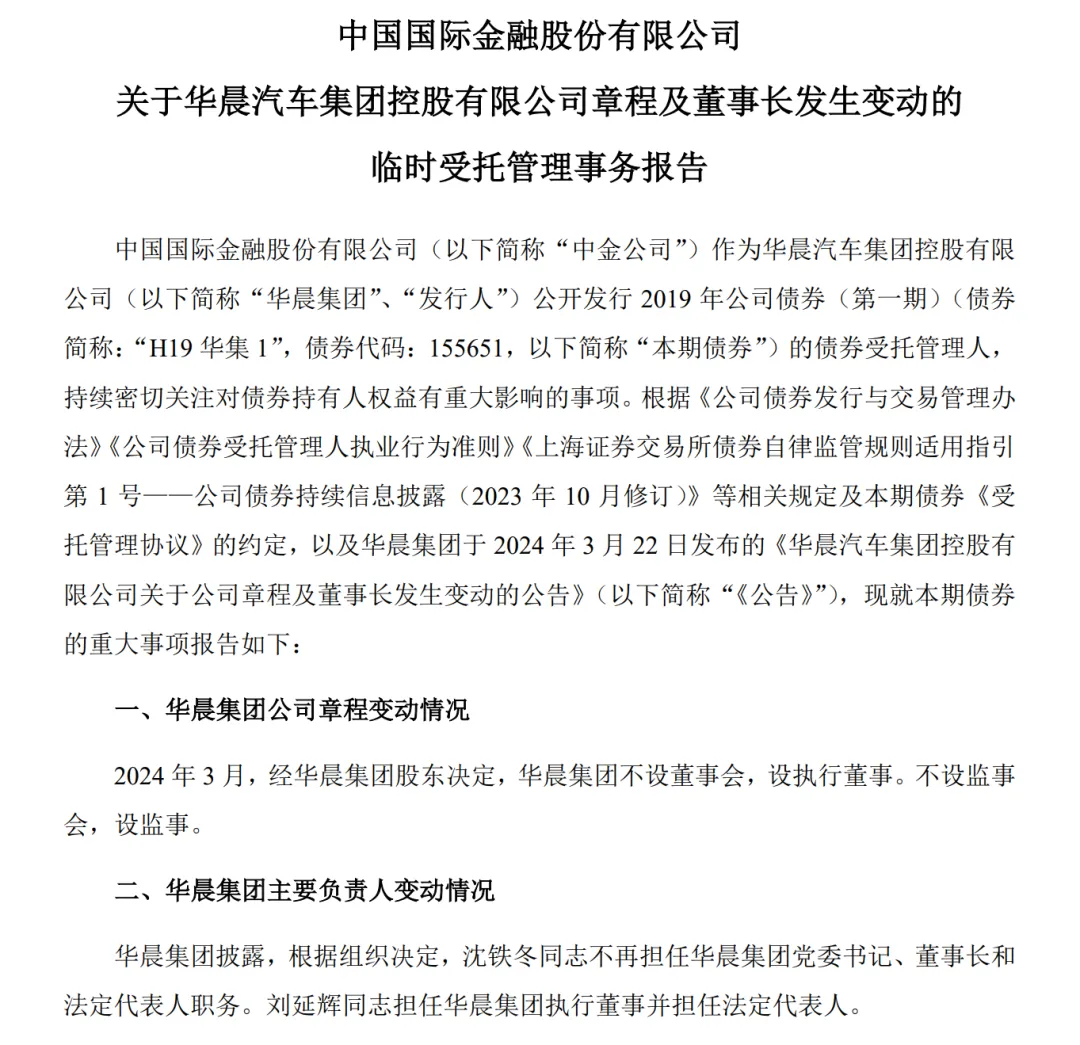 3月26日,中国国际金融股份有限公司(下称“中金公司”)发布临时受托管理事务报告。报告显示,华晨集团公司章程发生变动,经股东决定,华晨集团不设董事会,设执行董事,不设监事会,设监事。同时,华晨集团发生重大人事变动,沈铁冬不再担任华晨集团党委书记、董事长和法定代表人职务,刘延辉担任华晨集团执行董事并担任法定代表人。