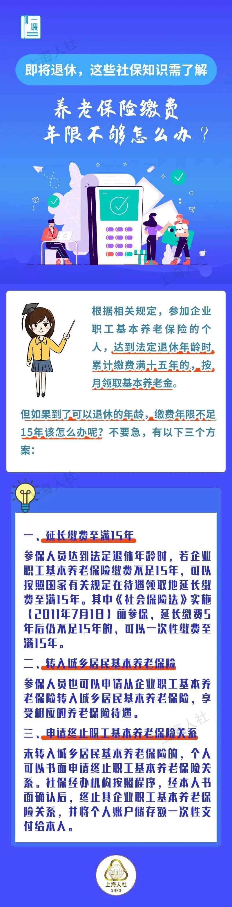 罗阿姨是一家服饰公司的出纳,参加的是企业职工基本养老保险。再过几个月,她就要达到法定退休年龄了,愉悦的退休生活即将开始。但罗阿姨最近却闷闷不乐,原来她的缴费年限还不满15年,还差了大概半年左右。这可怎么办呢?来看解答↓