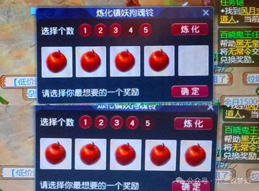 大家在降妖伏魔任务中获得的铃铛最后的时候点化都可以获得奖励,上面这位玩家炼化铃铛的时候却感觉铃铛的奖励好像都是经验呀,因为上面这位玩家用4个铃铛和5个铃铛进行炼化时,给的居然全部都是苹果,9个铃铛给了9个苹果,也就是9份经验,相当于上面这位玩家刷降妖伏魔任务的时候是来刷经验的。所以小编不建议各位玩家用多个铃铛进行炼化,两个铃铛或者三个铃铛炼化的性价比最高。