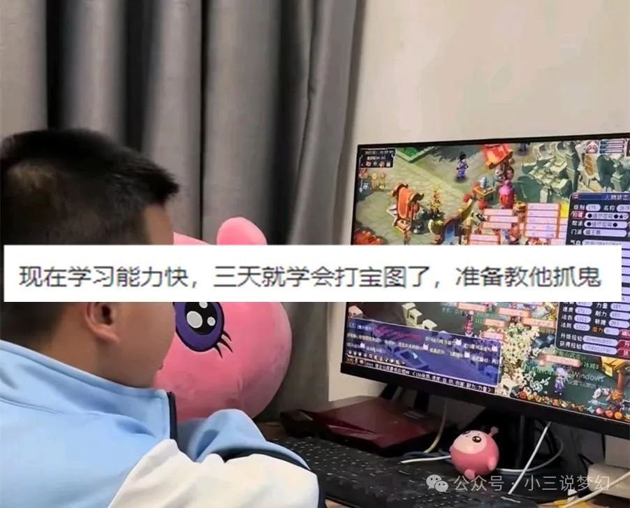 现在梦幻西游中玩家的年龄都是比较大的,在梦幻西游中30岁左右的年龄已经属于非常大众化的情况了,这个年龄段的玩家一般都是有后代的,上面这位玩家还是比较超前的那种,上面这位玩家的孩子现在应该都已经上小学了吧,然后上面这位玩家就开始教自己的孩子玩梦幻了,甚至还说孩子的学习能力特别的快,三天就学会了打宝图,后续会继续教抓鬼。全教会以后就相当于得到了一个免费的代练。