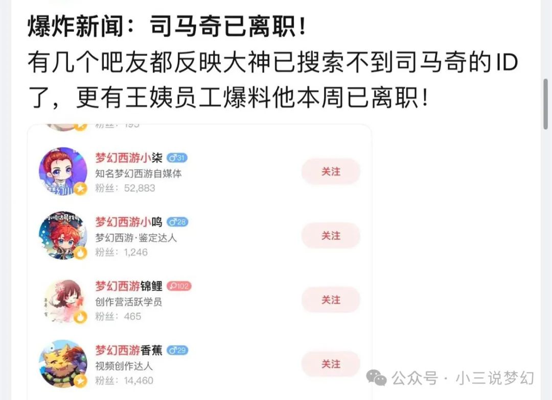 小编相信各位玩家应该都做到司马奇所代表的是什么?司马奇代表的就是梦幻西游策划组的某一个工作人员,现在有玩家说司马奇已经离职了,但是小编感觉上面这些玩家所说的这个消息不太准确,上面这些玩家所说的消息很有可能是自己想要得到的消息,真实的情况是策划并没有离职,如果策划在这段时间被离职的话,那就是被用来向玩家道歉的,这种情况下的离,一般的情况下都会有公告的,所以上面的这种传闻是假的。