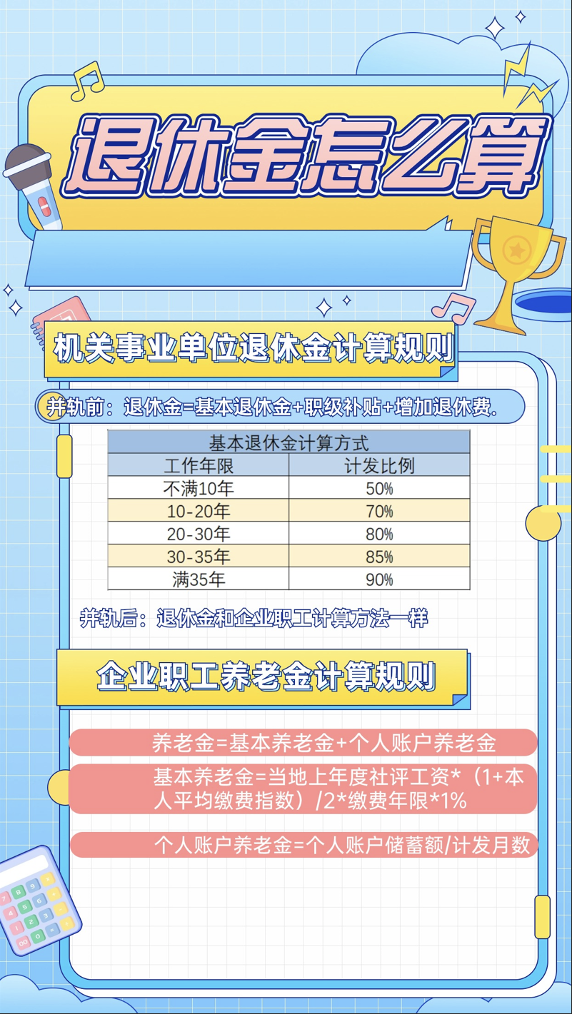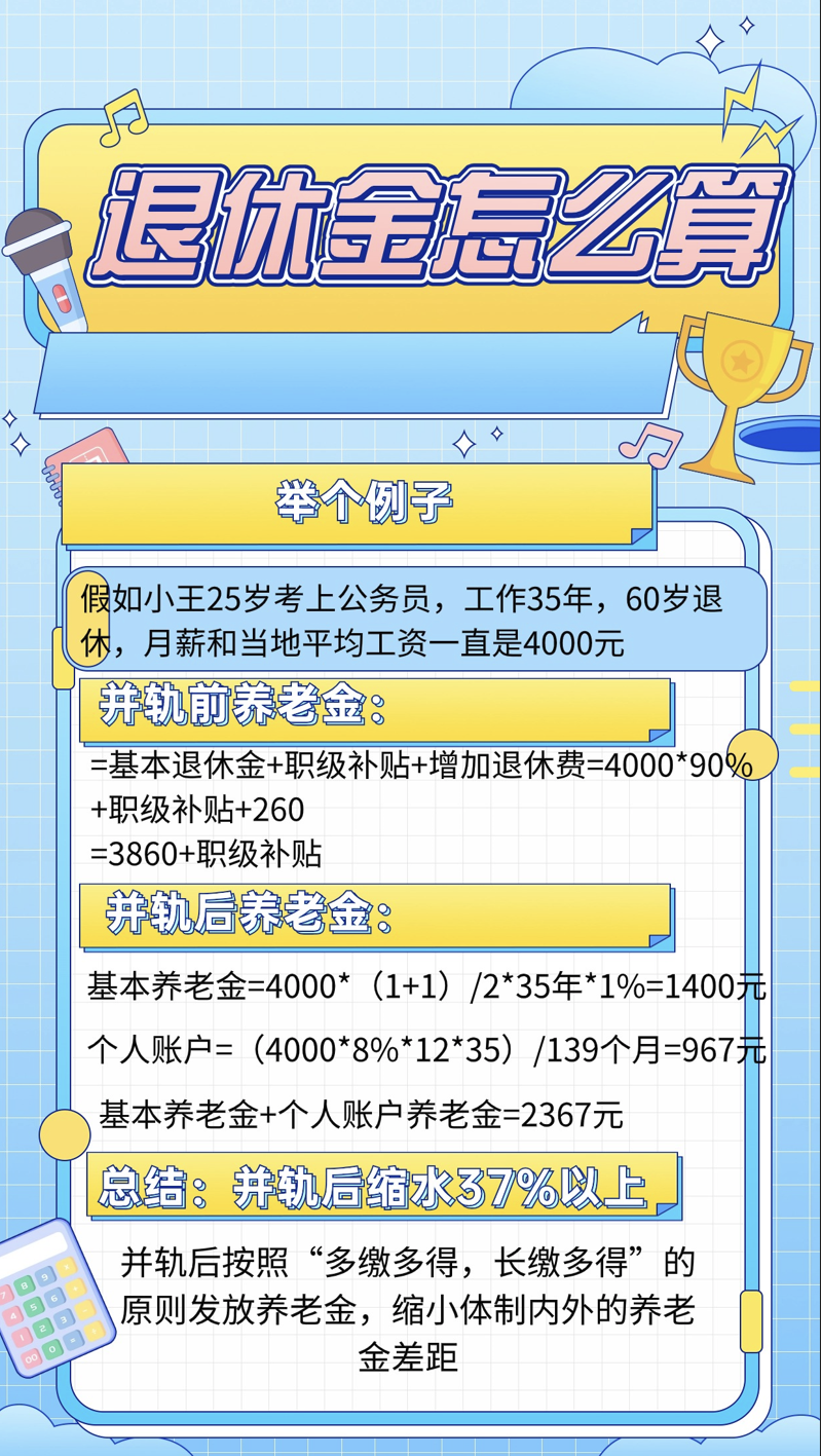 并轨前:机关事业单位退休金=基本退休金+职业补贴+增加退休费 其中基本养老金=当地社平工资*(1+本人平均缴费指数)/2*缴费年限*1%; 个人账户养老金=个人账户储蓄额/计发月数