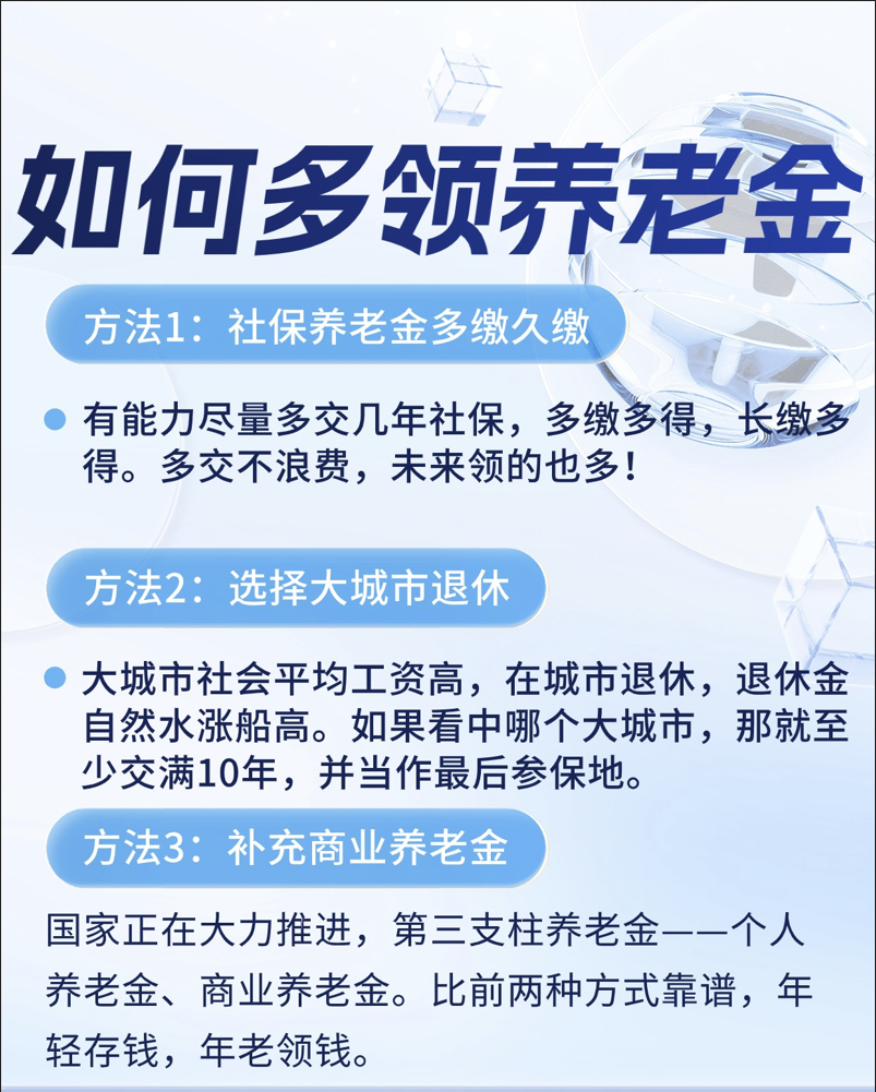 如果你是体制外,养老金想拿更多,可以从以下三个方面着手。一是社保养老金多缴久缴,二是选择大城市退休,三是补充商业养老金。part4