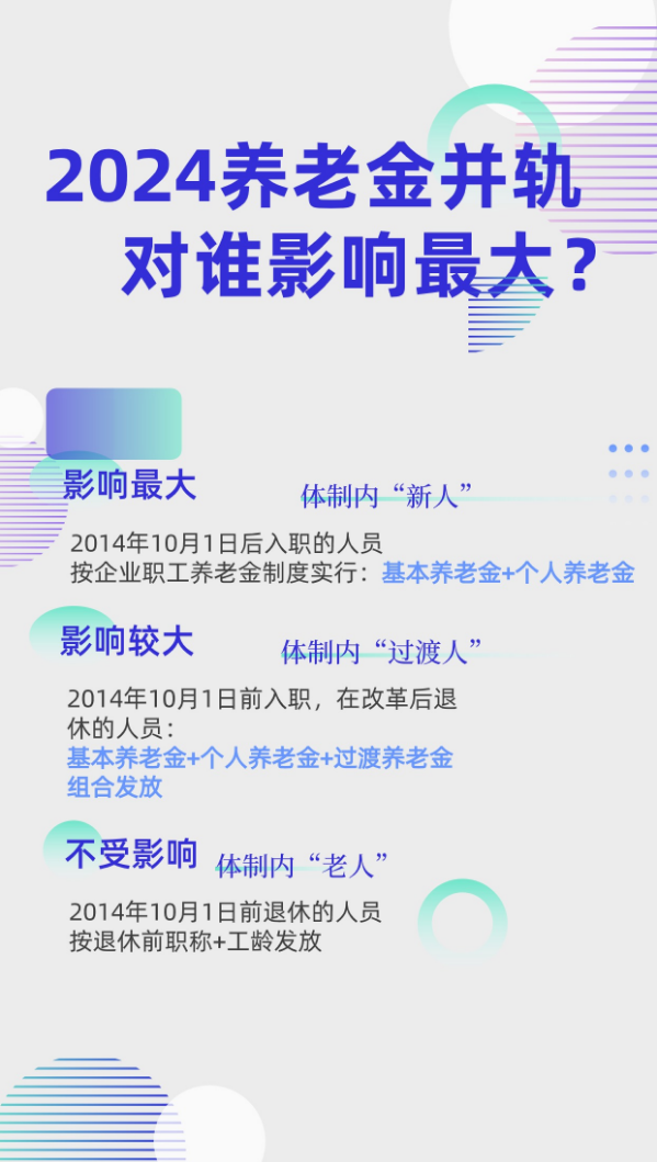 影响最大:体制内的“新人”——2014年10月10日后入职人员,将按企业职工养老金制度实行。 影响较大:体 制内“过渡人”——2014年10月1日前入职的,在改革后退休的人员,将按企业职工养老金制度+过渡性养老金实行。 不受影响:体制内“老人”——2014年10月1前退休的人员,按退休前职称和工龄发放。