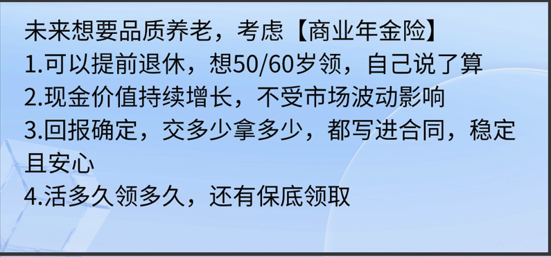 因此,如果想品质养老,建议补充商业年金险,具有多重退休年龄灵活、现金价值持续增长、回报确定、根据寿命年限领取、保底领取等多重优势。如果有相关需求或问题可以留言咨询CC老师哦!