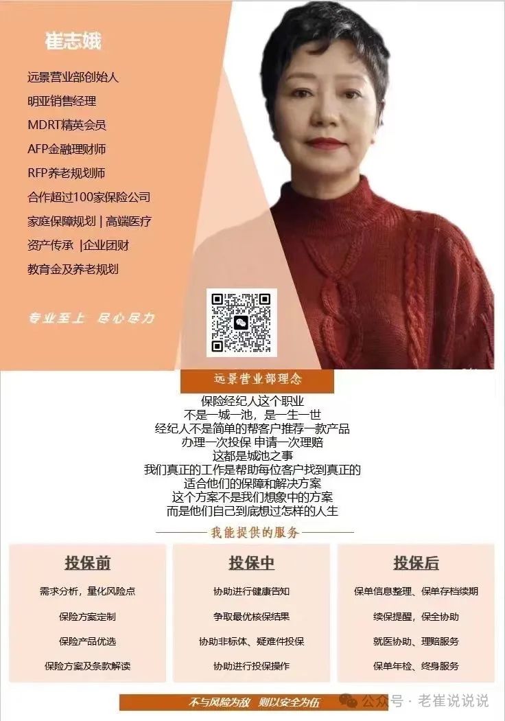 我是崔志娥,深耕保险行业二十五年,我的团队将为您提供专业化咨询服务。如果你想进一步了解个人养老、资产传承、婚前婚后资产隔离等相关内容,或者希望可以筛选到更加适合自己的保险产品,做到家庭资产科学化配置,请大家一定要加上我的微信:13932072546,我们隔壁小窗具体来聊。
