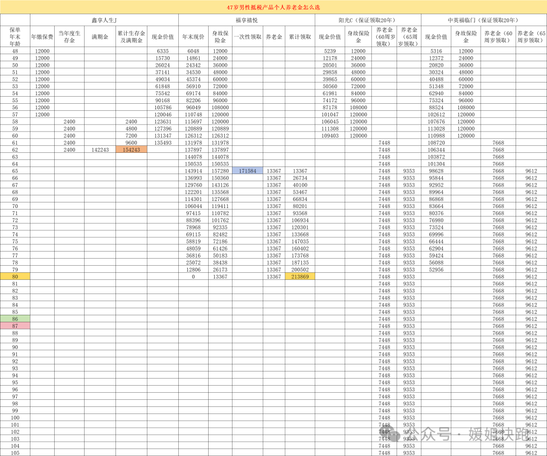 #这是媛姐陪伴大家的第95篇原创文章# #望点滴分享,启迪帮助链接之人# 服务理念: 静水流深,保险经纪人是最能说明长期主义的事业 千万人中,万幸得以相逢相知。 故宁肯投保前详细交流,健康告知仔细把关,也不愿为日后理赔埋坑,希望我的客户一生平安喜乐,但如若触发理赔,都会感念当初沟通方案,配置方案的我~ 服务风格: 靠谱认真,投保前中后实时沟通反馈 耐心细致,凡是链接到的客户,不论保费大小,不踩不捧,践行知识有价 温暖不粘人,保证客户的知情权,也尊重客户的选择权 其他可链接服务:你我之间不止于保险 今天媛姐想要跟大家分享一个个人养老金选择逻辑的实例。 客户情况:47岁,男性,选择可抵税的个人养老金产品,每年12000元,交10年内,假定个人应纳所得税税率是25%。 也就是说实际缴纳成本是12000-12000*0.25=9000元,10年的总成本是9万元。 媛姐对目前市场主流的个人养老金产品做了整理和分析,结论如下: 结论一:想要补充源源不断的养老金,选择中英福满临 无论是60周岁还是65周岁领取,中英人寿福临门养老年金都超过阳光人寿阳光寿C款,且两款都是【保证领取20年】的产品。 结论二:想要补充养老金,但自觉无长寿基金,选择太平人寿福享禧悦 同样65周岁开始领取,福享禧悦保障期间是15年,所以领取到80周岁,累计领取是213869元。 而如果阳光人寿阳光寿C想要实现同样的累计领取金额,要到87周岁,中英人寿福临门也要到86周岁。 结论三:想要做一个中期的存钱理财产品,那选择鑫享人生J款 下面附上媛姐做的详细对比~ 说明: 2、福享禧悦可以年领,也可以一次性领取,领取时间再法定退休年龄之后就可以 3、保证领取20年的意思是:比如中英福临门,60周岁开始每年领取7668元,但保证领取到80周岁,这个期间万一领取着人没了,会把没有领取的部分一次性给受益人,换言之是保本的,怎么样都不会亏~ 4、身故保险金和养老金是二选一的概念,不是共存的 5、税率不同,抵税金额不同,但原理是税率越高=抵税金额越高=成本越小=收益更优,所以税率超过10%的人其实都可以动动手指买一份,国家给的羊毛不要白不要对么?~ 以上就是今天要分享的内容,关于抵税&节税都欢迎大家骚扫码二维码跟媛姐聊聊~ 世界那么大,你我链接多么神奇 我是媛姐,坐标广州 喜爱阅读,热爱写作 借由文字的力量启迪帮助链接之人 既然已经看到了这里 那请搓搓小手右下角点亮【再看】和【大拇指】呗 往期文章精选 一、增额终身寿 存钱新思路,20万投入换每年7100元领取到终身,20万还随时可以拿回~ 2022年总结|人生没有白走路,那个离职2年去卖保险的女孩怎么样了? 六、团队发展类 |