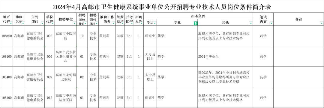 根据本市卫生健康事业发展和人才队伍建设需要,按照国家和省有关公开招聘事业单位工作人员规定,高邮市卫生健康系统事业单位现面向社会公开招聘专业技术人员,公告如下: 一、报考条件 (一)具有中华人民共和国国籍,享有公民政治权利。 (二)遵守中华人民共和国宪法和法律,拥护中国共产党领导和社会主义制度。 (三)具备良好的品行。 (四)符合《2024年4月高邮市卫生健康系统事业单位公开招聘专业技术人员岗位条件简介表》(以下简称《岗位简介表》,附后)中各岗位所规定的具体资格条件。 (五)具备正常履行岗位职责的身体条件,年龄为18周岁以上、35周岁以下(1988年4月10日至2006年4月13日期间出生,其他限定的年龄计算参照此方法进行);普通高校硕士及以上学位2024年应届毕业研究生、依法退出现役的退役军人、具有中级专业技术资格的人员,年龄可放宽至40周岁;具有副高级及以上专业技术资格的人员,年龄可放宽至45周岁。 (六)取得祖国大陆普通高校学历的台湾学生和取得祖国大陆承认学历的其他台湾居民应聘时按国家和我省的有关规定执行。 (七)符合招聘公告规定的其他条件。 应聘人员与事业单位工作人员有夫妻关系、直系血亲关系、三代以内旁系血亲关系、近姻亲及其他须回避的亲属关系的,不得应聘具有直接上下级领导关系的管理岗位,以及《事业单位人事管理回避规定》要求回避的岗位。 现役军人,国民教育序列普通高校在读非2024届毕业生,不得报考。 2024年10月13日前,5年服务期未满的新录用公务员(含参照公务员法管理单位工作人员)、经公开招聘被江苏省地方各类事业单位聘用且3年服务期未满的在编(在册)人员、有规定(含协议明确)不得解聘离开现工作单位(岗位)的人员,不得报考。 国家和省另有规定不得应聘到事业单位的人员,不得报考。 二、招聘单位、招考岗位条件 可直接登录高邮市人民政府网站(http://gaoyou.yangzhou.gov.cn),查询《2024年4月高邮市卫生健康系统事业单位公开招聘专业技术人员岗位条件简介表》。 三、招聘程序和方法 招聘工作按照报名与资格审查、笔试、面试、体检、考察、公示和聘用等程序进行。 (一)报名与资格初审 1、报名方式及时间 考试报名采用网络方式进行。报名、照片上传、资格初审和缴费,通过网络同步进行。应聘人员在高邮市人民政府网站上按岗位要求和网上提示如实填写本人信息。 报名、照片上传时间: 2024年4月10日09∶00-4月13日16∶00; 资格初审时间: 2024年4月10日09∶00-4月14日16∶00; 缴费时间: 2024年4月10日09∶00-4月15日16∶00。 报名网址:高邮市人民政府网站(http://gaoyou.yangzhou.gov.cn) 应聘人员网上提交报名信息24小时后可到报名网站查询是否通过资格初审,通过资格初审的,不能再改报其他岗位。通过初审后进行缴费,完成缴费后,报名方为有效。应聘人员使用开通网上支付功能的银行卡在网上缴纳有关费用。 2、报名注意事项 (1)应聘人员要仔细阅读并确认诚信承诺书,应按岗位要求和网上报名系统提示,如实、准确、完整地填写年龄、学历、专业等报名信息,所填信息须与本人所持有效证件、证书等保持一致,并上传本人近期免冠正面2寸(35×45毫米)电子证件照片(jpg格式,大小为20Kb以下)。 资格审查贯穿招聘工作全过程,应聘人员提供虚假报考信息及申请材料的,一经查实,即取消报名资格、考试资格乃至聘用资格等。 (2)报名前,请务必认真阅读招聘公告、报考指南、《岗位简介表》等,弄清具体规定,遵循相关要求,准确选报岗位。 (3)应聘人员只能选择《岗位简介表》中的一个岗位进行报名;报名必须使用在有效期内的二代身份证;资格未初审或资格初审未通过的,在报名时间截止(4月13日16∶00)前可以改报其他岗位或更改报名信息。 应聘人员应在规定时限内尽早选择岗位进行报名,以便在资格审查未通过时,可及时改报其他岗位。 (4)报名结束后,达不到《岗位简介表》规定开考比例的岗位,按规定的办法、程序,适当降低开考比例;此后仍无法开考的,相应核减该岗位招聘计划,直至取消该岗位(其中,不同单位因招考条件相同而按同一岗位招聘的,岗位招聘计划核减后,相关单位招聘计划最终在该岗位拟聘用人员确定后,根据拟聘用人员自主选择受聘情况相应自然减少乃至取消),有关情况及时在网站公布;报考被取消岗位并通过该岗位资格审查且缴费成功的人员,可于4月16日09:00-12:00重新登录报名网站改报其他符合条件的岗位。 (5)学历要求为“研究生”的岗位,《岗位简介表》中儿科、急诊科、精神科、医学影像科(含超声、放射、影像)紧缺学科专业岗位(不含面向高邮市生源的我省农村订单定向医学生岗位),上述各类岗位最终报名成功人数为该岗位招聘计划3倍及以下的,考试直接采用面试的方式进行。 (6)享受国家最低生活保障家庭的应聘人员,先在网上缴费,于2024年4月22日-23日联系高邮市卫生健康委员会人事科(联系方式:0514-85086639)办理减免报名费用事宜。 (7)通过报名资格初审的应聘人员,须及时缴纳报名费用,逾期未缴费视作报名无效。 缴费成功后不退还报名费,但应聘岗位被取消或符合条件的最低生活保障家庭人员除外。 3、网上打印准考证 应聘人员应在2024年4月19日-20日自行登录高邮市人民政府网站下载并打印准考证。 4、资格初审 应聘人员年龄、学历、专业等报考资格初审工作