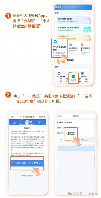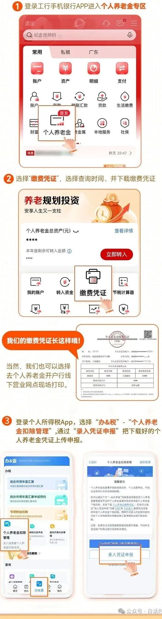 (缴存了个人养老金的朋友请先看2) ![]() 年度综合汇缴操作指引 ![]() ![]() 登录个税APP,从首页下方进入“综合所得年度汇算”。 第一步:核对收入信息。 ![]() 第二步:核对专项附加扣除信息。 ![]() 第三步:其他信息扣除。 ![]() 第四步:点击提交。 ![]() 个人养老金退税攻略 ![]() ![]() 首页-“年度综合汇缴”位置往后滑,有个人养老金扣除管理可直接进入,如没有,在更多功能中找。 有两种申报方法: 01 方法一:“一站式”申报(推荐) ![]() 02 方法二:录入凭证申报 ![]() ![]() 可扣除内容及标准 ![]() 基本减除费用 即年度免税额度,60000元/年。 专项扣除 三险一金中个人缴纳部分。 专项附加扣除 ![]() 其他扣除 ![]() 公益性捐赠 通过境内公益性社会组织、县级以上人民政府及其部门等国家机关,向教育、扶贫、济困等公益慈善事业捐赠的,一般情况下扣除以应纳税所得额的30%为限(特殊情况可全额扣除)。 END |