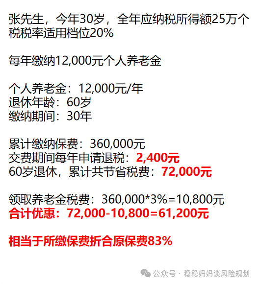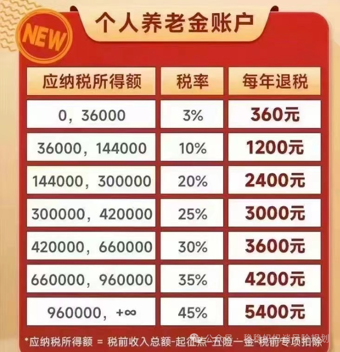 税率怎么查? 打开【个人所得税APP】——【服务】——【申报服务】——【已完成】——【2022年度】——(申报记录详情-申报记录,往下拉)倒数第4行【应纳税所得额】 (假如,2023年全年收入和2022年一样) 到底可以退税多少? 找到自己2022年的应纳税所得额,看下图区间,对应的税点,就是个人养老金对应的税点 退税额度=缴存额度(如顶格缴纳1.2万元)*税率(如10%),次年汇算清缴的时候就可以退税1200元,税率越高,退得越多,最高个人养老金年度可退税5400元。 5、退休时领取个人养老金 领取环节,由商业银行代扣3%个人所得税后,转入本人社会保障卡。 税优个养产品推荐 个养版的养老年金保险有很多,有趸交的,有3年、5年、10年、15年、20年、30年交的,或交至65岁等,不同公司提供的保单外的增值服务也不同,按需选择。 担心工资不稳定,可以选趸交(只交1年)的产品,抵扣次年的个税,比如,工银安盛人寿盛世颐年养老年金保险(个人养老年金)、太平盛世福享禧悦养老年金保险(个人养老金)等。不足之处就是每年需要购买个养版的养老年金保险,或者你后面打算用其他工具也是可以的,但补充养老金,终身现金流还是建议用商业养老年金保险是首选,安全确定有保障、还增值。 如果工资很稳定,完全可以选长期缴费,这样比较省心,不用每年换产品,每年12月31日之前交费,次年3月-6月汇算清缴时就可以抵个税了。比如,中英人寿福临门养老年金保险(个人养老年金),阳光人寿阳光寿C款养老年金保险(个养版)等,他们家还有非个养版的,个养版才抵个税,注意区分,没有退税需求的考虑非个养版的养老年金保险,选择会更多。 以中英人寿福临门养老年金保险(个人养老年金)举例,供大家参考: 保险期间为终身,有2个方案,选择: 方案一:保证领取20年; 方案二:保证领回保费。