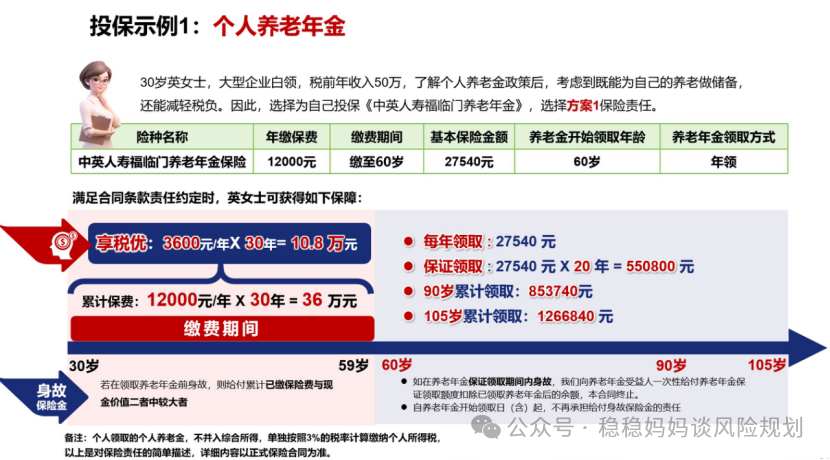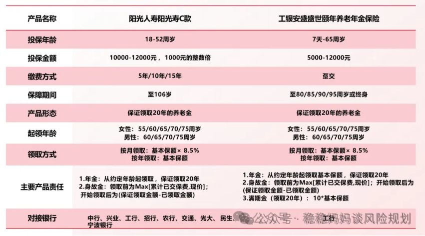 SOS全球紧急救援为你出游出差保驾护航。 健康咨询,春雨医生24小时在线图文问诊 不展开了,关注我,私信聊吧。 欢迎阅读我上个月的相关文章,点击阅读吧! 以下是阳光人寿阳光寿C款、工银安盛人寿盛世颐年养老年金 越来越多人都愿意拿出更高比例的收入作为未来养老退休的财务储备,个人养老金税优1.2万元并不能完全覆盖全部需求,其个人养老金账户建立仅是一部分养老储备的补充。 商业养老年金保险目前和未来都会是香饽饽,越早买养老年金保险,投入越少,未来领取的养老金越多哦!积少成多,一张一张保单慢慢积累,慢慢变富,做个有钱的幸福的老头老太太吧!