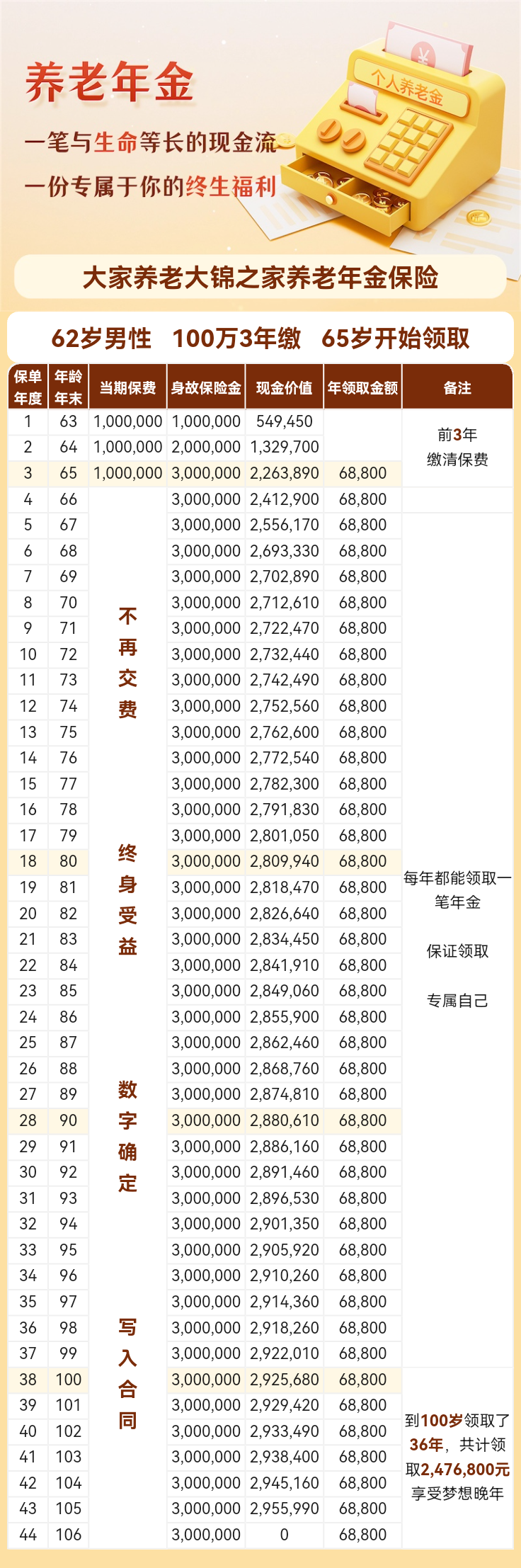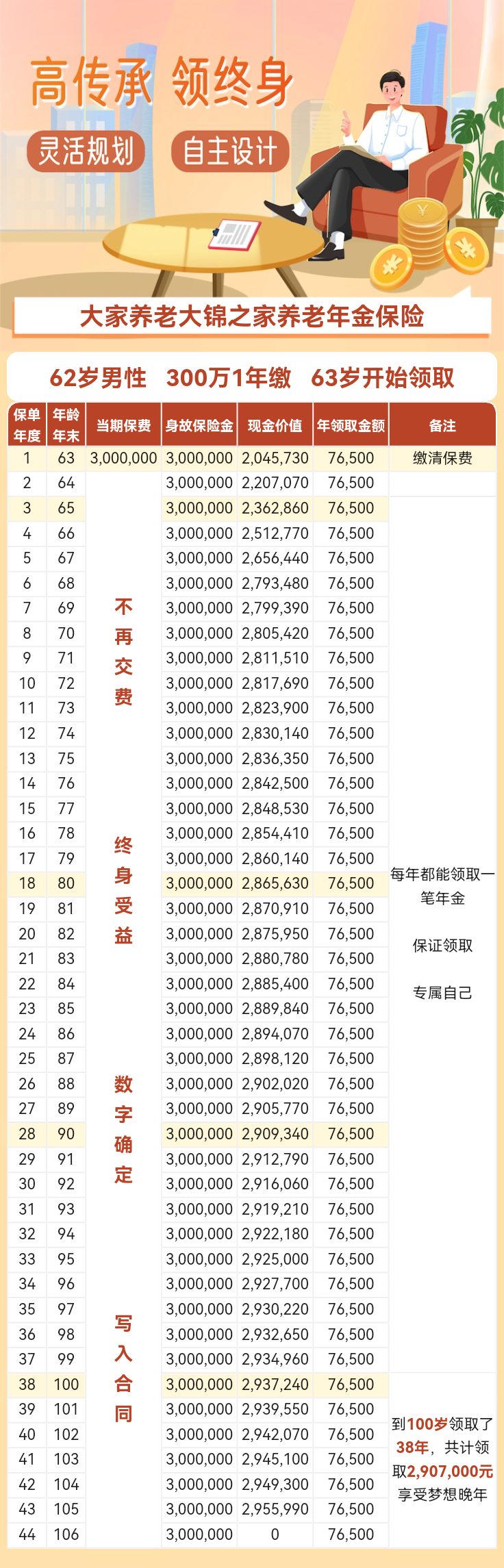 ![]() 张爱玲说过,出名要趁早。 其实何止是出名要趁早。 在中国这么卷的社会, 什么都被要求要趁早。 比如, 结婚要趁早, 生娃要趁早, 娃娃教育要趁早, 不能输在起跑线上。 就连买养老金也要趁早。 毕竟时间够长,复利效果才会更明显。 还因为市面上的养老金大多都对投保年龄有要求,比如60岁以下或55岁以下。 当然,这也很好理解, 毕竟法定退休年龄摆在这里, 大部分的人还是希望能够早早开始领取养老金的。 现在就有一款中老年人专属养老金,80岁都还可以投保。 女性:52-80岁可投保 男性:57-80岁可投保 缴费期短,只有趸交和3年交。缴完即开始领取养老金。 而且无健康告知要求,真的对上了年纪的人特别的友好nice。 假如苏大强买这款养老金会怎样?假如苏明玉给苏大强买了这款养老金来养老,而不是用房子养老的话呢? 假设苏大强是62岁,如果明玉是一次性300万为苏大强投保了这份养老金。 ![]() 那么缴完保费的次年,即苏大强63岁开始,每年领取76500元(也可选择月领)。 活到老,领取到老,终身源源不断现金流。 也可选择月领,月月自动到账,“本”钱还一直在。 如果身故,还能赔付保费,300万“本”钱原封不动给到受益人。 如果是选择3年缴费,每年100万的话, ![]() 那么缴完保费的次年,即苏大强65岁起,每年领取68800元(也可选择月领)。 活到老,领取到老,终身源源不断现金流。 也可选择月领,月月自动到账,“本”钱还一直在。 如果身故,还能赔付保费,300万“本”钱原封不动给到受益人。 有了这样一份养老金,苏大强每月有了最基本的生活费用,源源不断。 苏家三兄妹再也不担心父亲苏大强被小保姆假结婚骗走财产。 就算这个月的钱被小保姆或卖保健品的骗走了,下个月的养老钱又到账了。 实在是相亲利器,防诈骗神器。妥妥的中老年专属养老金!