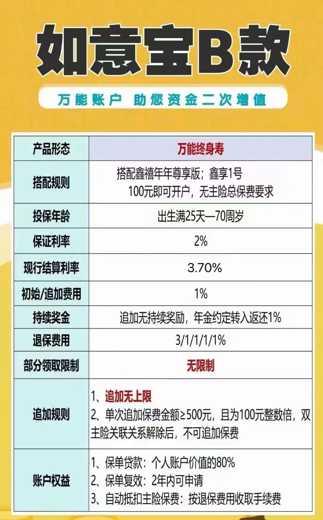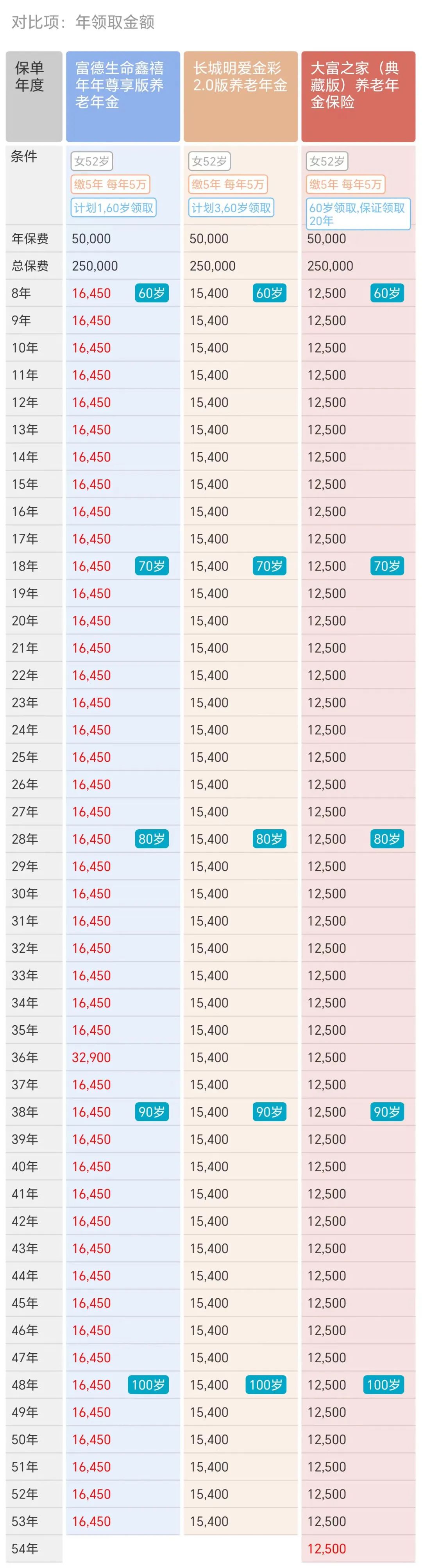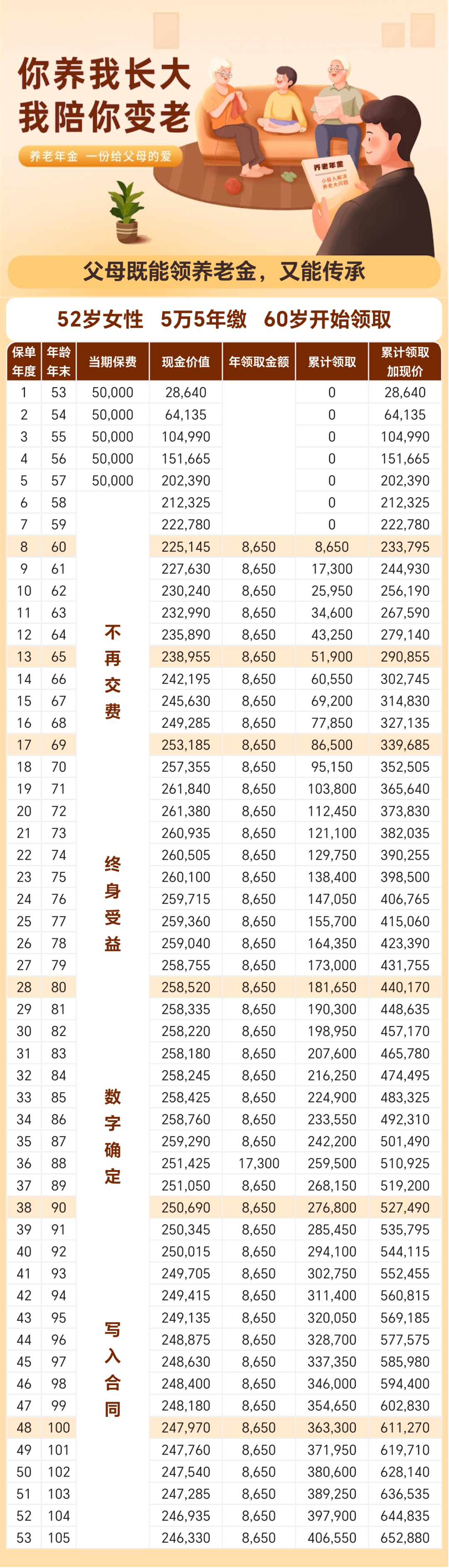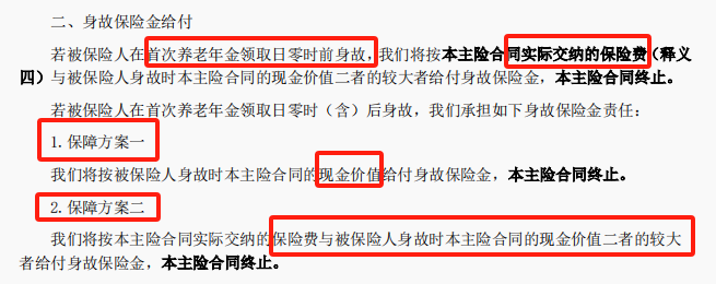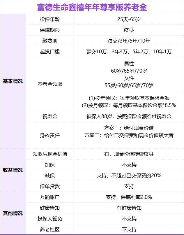 点击上面蓝字,关注我吧 ![]() 【建议收藏】 给50多岁父母买养老金 顶级——富德鑫禧年年尊享版 写在前面 晏顺娟 明亚保险经纪资深合伙人 / 销售经理 本科毕业于四川大学,研究生毕业于浙江大学 2018年央企工程师转型保险,从业第6年 连续三次达成百万圆桌MDRT、COT (行业达成率不足0.3%) 服务了超380个家庭,国际认证的理财规划师 可以帮你从全国100多家保司产品里优中选优 正文开始 随着人口老龄化趋势的加剧,很多朋友开始咨询养老金,提前做养老规划。也有不少朋友在咨询考虑给50多岁,甚至60多岁父母买养老金。 ![]() 主要出于两个担心: (1)父母有养老金,但是领取比较少,每个月就1000左,担心不够花! (2)父母没有养老保险,退休后没钱可领,担心父母没有安全感,以后自己压力也大。 希望父母自己能按月领点养老金,可以领一辈子!哪怕一个月有或者多补充1~2千到账,也好,做子女的也能少操很多心。 ![]() 1 产品介绍 富德鑫禧年年(尊享版)的基本信息如下: ![]() 鑫禧年年(尊享版),最高65岁可以投保,趸交10万元起,期交7000元起,养老金活到老领到老,年龄达到88岁,还能给付祝寿金 ,现金价值持续至终身,支持附加万能账户。 它有两个领取方案可选择: 方案一领取金额高,现价持续终身(后期现价逐渐减少) 方案二领取更低,但是现价高,考虑传承适合。 ![]() 养老金领取: 可选择月领和年领:男性领取可以选择60岁、65岁、70岁;女性多一个55岁选择 ![]() 身故保险金: ![]() 2 真实收益演示 以母亲52岁,每年攒5万,分5年交,60岁开始领取为例: 方案一:领取金额更高,现金价值更少 方案二:领取金额更低,现金价值更高 方案一:领得多 ![]() ![]() ![]() 3 和热销同类产品对比 和同样市面上同样还比较火热的养老年金相比,「长城明爱金彩2.0」和「大富之家(典藏版)」相比怎么样呢? ![]() 总结:从上面数据可以看出,如果用来做养老规划,和市场同类产品相比,「富德鑫禧年年尊享版」的养老金,领取金额比较高,还终身有现价,优势很明显。 但也有一个缺点,「富德鑫禧年年尊享版」没有保证领取20年,上图「长城明爱金彩2.0」和「大富之家(典藏版)」都是保证领取20年,如果在比较极端情况,领取前几年就身故,给到家人的钱不如保证领取20年多。 这点要注意一下,有疑问再来探讨! 4 增值服务 1、万能账户 本款产品可附加如意宝B款万能账户,保底利率2%,当前结算利率3.7%(可变)。如果有闲钱可以放在万能账户,也能持续增值,多一个额外的投资渠道。 无论从进入的手续费还是前5年取钱的手续费,相对市场很多万能账户,算比较友好的。 ![]() 趸交/追加/年金转入保费会扣除1%的初始费用,只有年金转入的部分有1%持续奖励,趸交和追加均无持续奖励。(如果每年的养老金不领取,可转入万能账户享受再次增值,转入、转出折算后为0费用) 合同生效后,放进去的钱前5年若要领取,会收手续费:3%、1%、1%、1%、1%。 从第6年开始,领取则没有手续费。 可以追加的保费暂时不设上限,但要注意保司未来也可能会调整追加额度。 2、可变方案,更灵活 ![]() 富德有两个计划,方案1和方案2各有优缺点,但是我们也不用再纠结了,因为它还有一个非常大的优点,就是在合同里写明:在领取养老金之前,还可以更改计划,意思就是计划1和计划2可以在领取之前相互切换,领取前再定。 3、可减保 ![]() 可以减保的权益,很难得。大部分的养老年金不具备这项功能。 合同生效5年后,可以减保取现。每年不超过累计已交保费的20%。未来可灵活取钱周转也是一大笔钱。 由于该产品终身都有现金价值,该功能给养老金也多了一份灵活性。万一急用钱,可以救急。 5 保司背景介绍 有人说,产品很好,但是公司没怎么听过,其实富德生命人寿也是一家实力非常雄厚的公司。 富德生命人寿是一家持有全投资牌照的保险机构,分支机构广泛。目前35家分公司,1000多个分支机构和网点,2022年第12次入选“亚洲品牌500强”。 ![]() 2002年成立,注册资本金超117.52亿,总资产规模近4500亿。保费规模连续多年达到千亿平台,妥妥滴大公司。 ![]() 6 尾声总结 富德鑫禧年年(尊享版)养老金领取前,有两个方案可以灵活变更。方案一领取金额高,现金价值持续终身,适合想要领取高并且有一定传承功能的人群。方案二现金价值高并且持续终身,身故给付一大笔钱(不低于总保费),适合有传承需求的人群,‘’0本金给父母养老”。 还可以减保取现,可以附加万能账户,在养老金市场会非常有竞争力。 如果你正在考虑做养老金规划,可以扫码微信联系我,获取专属咨询,找到最适合你的专属解决方案。 ![]() END |