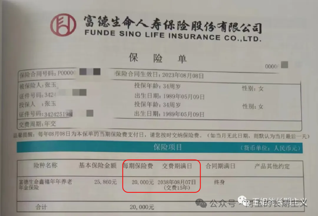 - 第61篇原创 - 先看这里:Hi,不妨先认识下呗~ 2024年养老金产品 阿玉自己的配置 养老金的那些细节 养老金VS增额寿 很多人想给自己配置养老年金保险,但是市场上产品众多,条款复杂,一时之间不知从何着手,今天阿玉以路人视角整理出,配置养老年金的保姆级教程,供参考。 总结起来就三步:梳理需求算需要补充的差额、选择缴费方式和保障期间、选择产品领取方式。 01 梳理需求算需要补充的差额 养老年金作为提供现金流的工具,主要是满足退休后的日常生活费开支,简单的方式,是按照满足自己当前的生活费*4%*距离退休年份。 比如目前的生活开支每月3000元,距离退休还有15年,那么理想的每月养老金金额为3000元*4%*15=4800元。 测算自己的社保养老金,各省份略有差异,通常累计缴费年限15年,社保养老金为1000-2000之间,具体可以联系阿玉测算。 这样用需求的退休金额4800元-2000元(假设)=2800元。那么就确定了,至少需要配置一个年领取3万左右的养老金。在此基础之上,条件允许,再多补充,退休后更宽裕。 02 确定缴费方式和保障期间 缴费方式和保障期间有非常强的个人属性,和个人的年龄、财务状况关系密切。 缴费方式,分为两类: 金额低年限久:这类就是每年的缴费金额低,但是拉长缴费年限,比如我自己的一份养老保险,就是2万15年交。 这样选的优势是可以降低年度缴费压力,通过拉长缴费年限,占住当下较高的收益产品。 不足是开始领取前,是需要完成缴费的,一些产品还需要提前一定年限完成缴费,所以,年龄较大的人,支持不了太长的缴费年限。 这种方式更适合距离退休15年以上人群,尤其是年轻人,降低缴费压力,甚至可以选择月交的产品,达到积少成多的成果。 金额高年限短:这类就是每年的缴费金额高,缴费年限短,与上面的相反,适合年龄较大的人群,距离退休10左右。