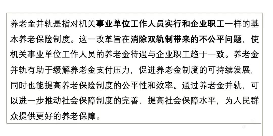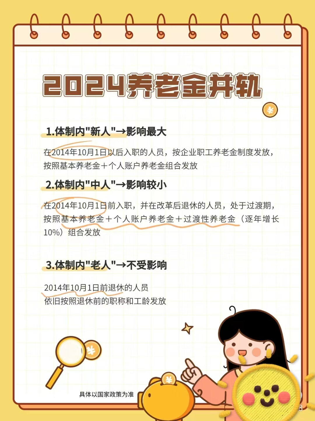今年是2024年,正是机关事业单位和企业养老金完成并轨的最后一年,颇有一点划时代的意义。全国大概有5000万机关事业单位的工作人员,虽然占人口比例并不是特别大,但这个人群的养老金待遇却备受关注。所以养老金并轨的这件事情,还是值得聊一聊的。 养老金并轨改革,全称是【机关事业单位工作人员养老金并轨改革】。这项政策,起于2014年10月1日。2014年10月,国务院发布了《关于机关事业单位工作人员养老保险制度改革的决定》,要求机关事业单位人员开始缴纳社会保险(含养老保险)费用,建立与企业职工一致的养老制度。通俗一点理解,就是“机关事业单位的养老金向企业看齐”。同时,设置了10年的过渡期,今年,刚好是最后一年。 有并轨,那说明之前就有双轨,篇幅有限,不能展开细讲。概括而言,企业员工是要缴纳社保的,并且退休后养老金待遇和企业员工的缴费水平紧密挂钩,我国现在的退休金替代率大概在42%左右。一位企业员工,退休前一万的月工资,退休后大概就只有4200的样子,这还是在足额缴纳社保的前提下。而机关事业的工作人员,在这个政策前,在职期间无须缴纳社保,退休金的替代率大概能有80%-90%,同样是退休前一万的月工资,机关事业单位和公务员的退休金有8000-9000元,除此以外,还有其他补贴和职业年金。这就导致了二者之间养老待遇的不公平,不公平,就会衍生很多负面的社会舆论,这也是国务院下定决心改革的原因。今年10月,10年过渡期即将结束,机关事业单位和企业养老金正式完成并轨。养老金并轨,说起来容易,做起来难。每一年都有那么多人退休,怎么能既可以保证不同批次退休人员的利益,又可以平稳过渡改革? 为了减小改革阻力,国家将机关事业单位职工按参加工作时间和退休时间的不同,分为了“老人”,“中人”和“新人”。执行的方针政策就是:“老人老办法,中人中办法,新人新办法”。 “老人”——指的是2014年10月1日前退休的人员,养老金是由工资部门按照退休前的职务级别和工作年限等因素来确认的。他们的退休待遇基本不受影响。“新人“——指的是2014年10月1日以后开始工作的,完全按照新的计发办法来领取养老金。从养老金待遇来说,这批员工其实受影响最大,但是因为之前和政策和他们无关,没有感知,就没有对比,没有对比也就没有伤害。”中人“——指的是2013年9月30日前参加工作、2014年10月1日后退休的人员。这部分工作人员就略显尴尬,因为横跨了两个时期,要用两种不同的计发方法。对于中人来说,貌似受到的影响更大,国家的处理方法,就是要平稳过渡,怎么过渡,国家给出了”视同缴费年限“和”过渡期保低限高“的处理方法。第一,对于”中人”来说,改革之前很多人是没缴纳过社保的,没有个人账户,怎么办呢?那就纳入”视同缴费“。举个例子,1992年参加工作的老张,2024年退休,他的养老金不能按照”老人“的标准执行。如果按照新政策,实际社保缴纳年限只有10年,老张的养老待遇岂不是要大受影响?这也不合理啊。为了照顾这部分群体的利益,国家会将老张2014年之前的工龄看作视同缴费。这就意味着,虽然从1992年-2014年这22年期间,老张完全没有没有缴纳过社保,但国家在核算养老金时,仍然会这段时间看作缴纳了社保的时间来计算。第二,对于中人,除此之外,国家还设置了过渡期”保低限高“的政策。养老金实行新老待遇计发方法对比,这部分人的养老金待遇,会用新老方法分别核算。如果新办法计发的待遇低于老办法的待遇标准,那么就按照老办法发放,退休待遇维持不变。如果新办法计发待遇高于老办法计发待遇,那么差额会逐年递增发放,每年增加10%,举例如下:一直到过渡期结束,2024年1月1日至2024年9月30日退休的人员,发放超出部分的100%,和新办法拉平。所以其实你看,至少在2024年前后退休的中人,养老金待遇并不受到太多的影响。过渡期结束后,也就是2024年10月1日后退休的工作人员,就完全按照新办法计发养老金了。挺公平的对吗?国家其实已经最大限度兼顾了机关事业单位不同时间段退休的人员利益。这个改革,其实影响的人群有限。但这个政策在网上,却引发了一大群局外人的评论。吃公家饭的,和没吃公家饭的,都开始互喷。前面讲的都是客观事实,不管你觉得公平也好,不公平也罢,这都改变不了现有的情况。这个世界上,有很多事情,是你我决定不了的。你要知道的是,十年过渡期已然结束,历史的车轮毅然决然向前行驶,也不必回头再看,看,也没有什么意义。我们80后,这一生,好像都在迎接各种时代和命运的变革,我们早已习惯了,不是吗?没有必要去探讨所谓的公平或者不公平,唯一要做的,是照顾好自己的生活。你觉得养老金够,那就多锻炼身体,好好活着,争取活得越久,领得越多,把自己的晚年生活,过成一道光,你觉得养老金不够,就想办法积极补充,选择你喜欢,你认可的方法就好。再怎么心有不甘,气愤郁闷,都于事无补,落实到行动上,不如把这些时间花在一些对你有意义,有益处的实际事情上。相关阅读: 我是怎么实现退休后月入过万的(上)