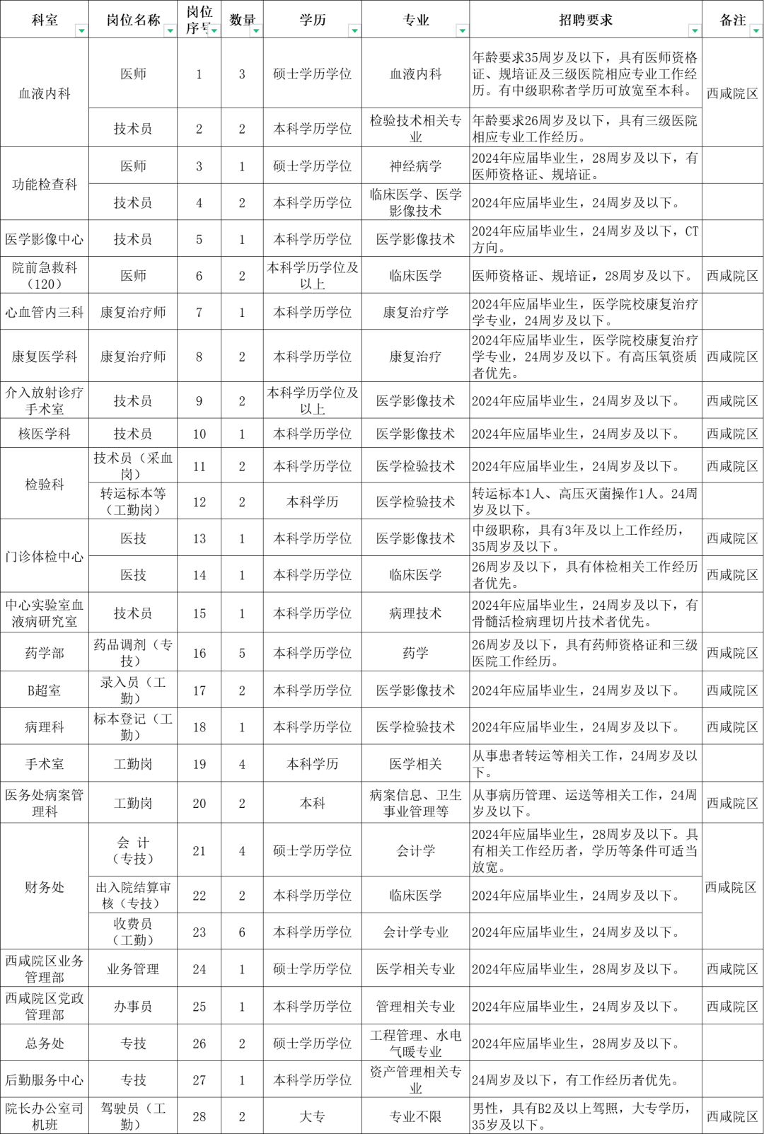 哈喽宝子们晚上好呀 今天给大家带来了陕西省人民医院 合同制医技类岗位的招聘 招57人!大专有岗! 一起来看看怎么报名吧! ![]() 因医院业务发展需要,现面向社会公开招聘合同制医技类岗位和部分临床科室工作人员。 一、招聘基本条件 1、具有良好的政治素质和道德品行,工作作风扎实,爱岗敬业,遵纪守法; 2、身心健康,能胜任工作; 3、具备岗位要求的学历学位、专业和技能条件; 4、能在岗位要求时限内入职; 5、贯彻落实住院医师规范化培训“两个同等对待”政策; 6、年龄、年限计算时间截止2024年4月30日。 7、应聘专业技术岗位,个人工作经验丰富、工作业绩突出者,招聘条件可适当放宽。 二、招聘岗位条件及职数 三、报名 1、报名时间:自发布公告之日起至2024年4月12日下午5:00止。 2、报名方式:本次招聘工作全部采取网络报名的方式进行,不设现场报名。应聘人员须微信扫描下方二维码进行报名登记,并提交相关电子版资料。 图源:陕西省人民医院 3、提交材料:身份证、所有学历学位证、学历电子注册备案表、学籍验证报告、学位网学位查询结果、个人简历、工作证明、技能水平、荣誉证书等资料。个人将相关资料发送至邮箱spphrsc@sina.com。 邮件标题格式为:学校+专业+姓名+应聘临床医技类XX岗位,除个人简历以附件形式发送外,其他资料均以图片格式粘贴至邮件正文。 4、仅扫描二维码登记或仅提交材料均为无效报名。 小提示:扫描下方二维码,关注【本地宝西安招聘】公众号后,在聊天对话框中回复【医院】也可快速查看详细招聘公告。 ![]() 一定要看 我要找工作/我要招人 可以点击下方小程序 进入查看更多的岗位信息 根据相关要求直接进行简历投递哦 可以点击下方小程序填写需求 公司通过审核即可免费发布招聘信息 右下角,您点一下在看 小编工资涨1毛 由于篇幅问题 今天招聘信息分享就到这里啦 意犹未尽的宝子们可以点击下方名片 进入【本地宝西安招聘】公众号 在对话框中回复【招聘】 就可以查看近期热门招聘了 以后每晚七点也能第一时间 收到当天最新招聘推荐啦 咱们下期再见哦~ 爱你们的每一天!!! 祝宝子们都前程似锦,万事如意! 向下滑动查看更多: 回复【事业单位】获取西安各事业单位招最新消息 回复【国企央企】获取各国企央企西安分公司招聘信息 回复【辅警】获取西安辅警招聘最新消息 回复【医院招聘】获取西安医院及卫生事业单位招聘信息 回复【学校】获取西安各类教师、教职工招聘信息 回复【银行招聘】获取各银行西安招聘信息 回复【招聘会】获取西安近期招聘会汇总信息 回复【见习岗】获取西安近期见习岗位汇总信息 ▌说明:本文由本地宝西安招聘整理发布,未经允许请勿转载!如涉及侵权或对版权有疑问,请邮件联系wanghua@bendidbao.com 删除处理。 ▌来源:图片来源于摄图网,素材来源于陕西省人民医院。 ▌编辑:小侯 如果您觉得有用, 请点个“在看”↓ 小编工资涨1毛 |