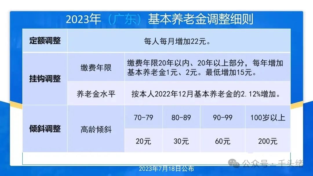 这一部分主要是针对高龄老人的倾斜,2023年广东省调整方案是针对2022年12月31日前(含当日)70~79、80~89、90~99和年满100岁以上的老人,每人每月增加基本养老金20元、30元、60元和200元。