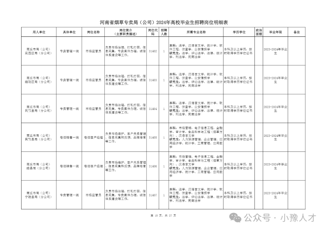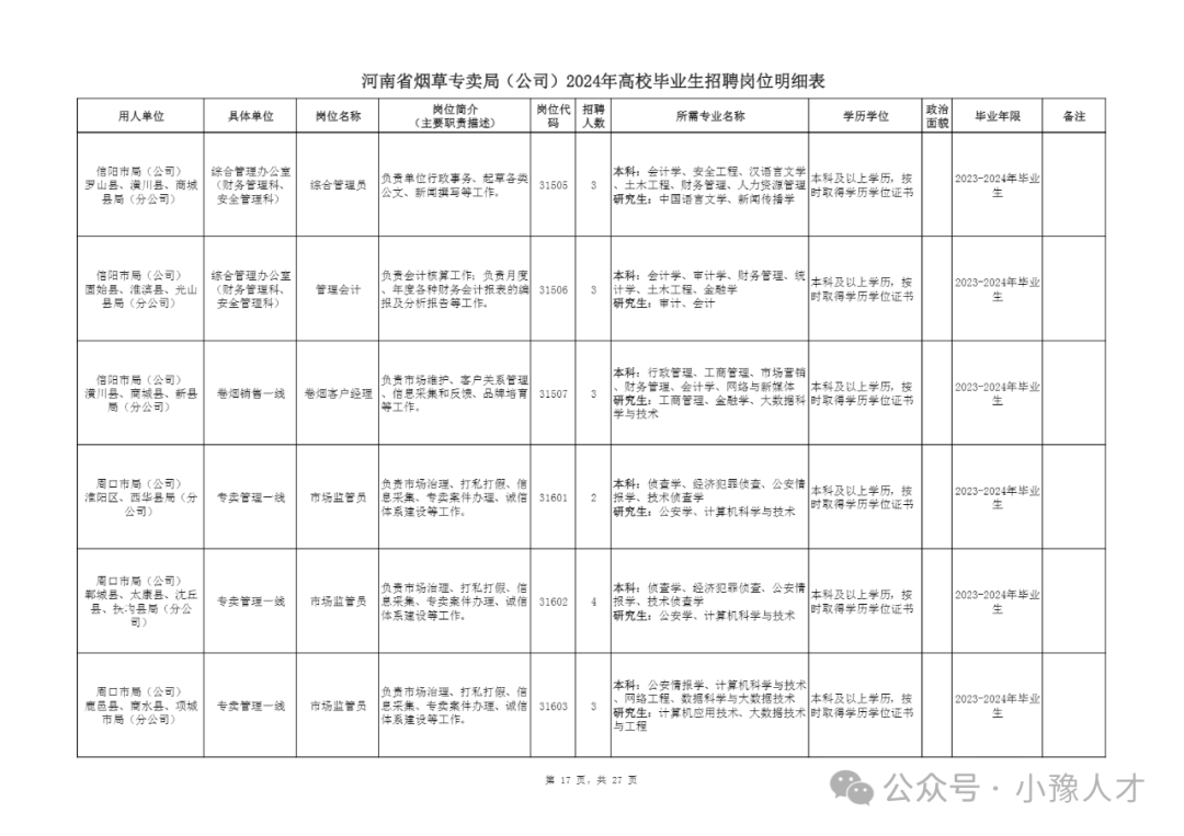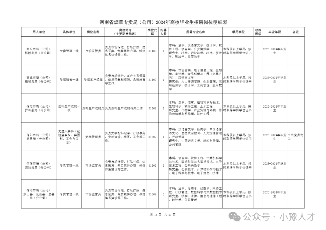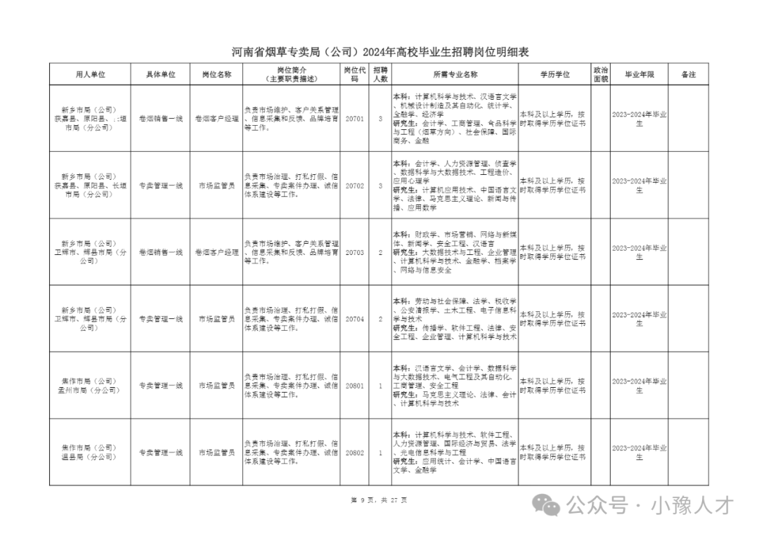 河南省烟草专卖局(公司)下辖18个市级局(公司)、133个县级局(分公司),主要承担辖区烟草专卖市场管理、烟叶生产经营、卷烟营销职能。根据工作需要,现面向社会公开招聘英才。
