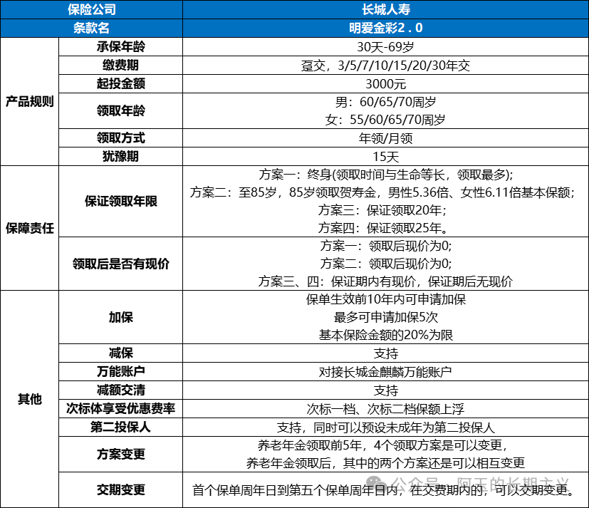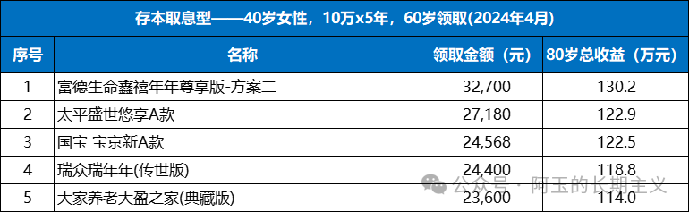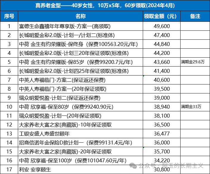 备注:不同性别、投保年龄、交费期、领取年龄测算出的结果排序会略有不同,具体可以联系阿玉测算。