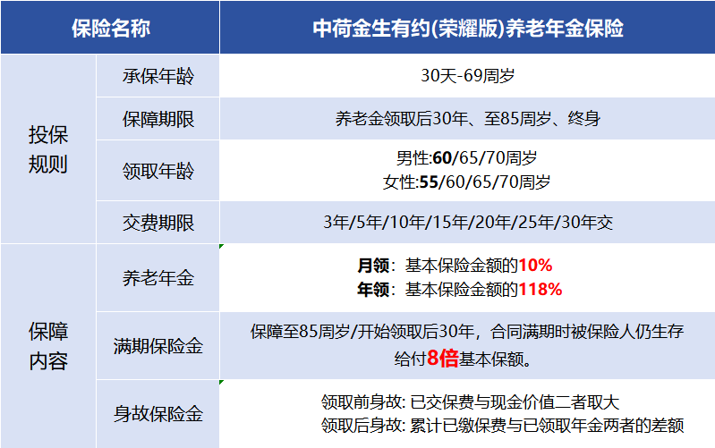 产品优势:领取金额也是前列,4种方案可选,可以在未来结合身体状况,灵活变更领取方式,非标体人群可以领取更高。产品劣势:非终身有现金价值,计划一和计划二,不保证领取,开始领取后,现金价值立刻为0,只能领取养老金,无减保/退保取现的选择。阿玉建议:计划一/二领取金额较高,纯养老金使用,对身体有信心人群、丁克、不打算传承的人群可以考虑,满足非标体体况,可以领取更高。3、中荷金生有约荣耀版