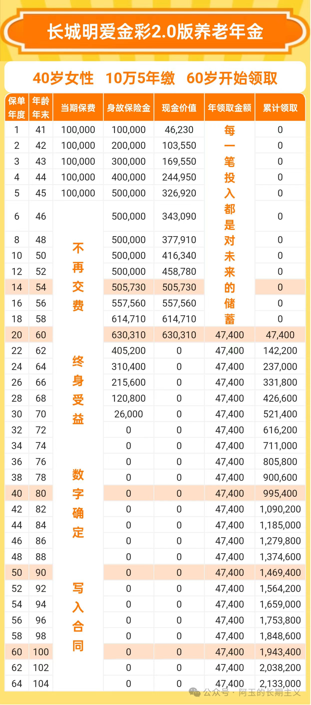从上表可以看到,投入的总保费,基本一直在现金价值账户里,类似增额寿产品。以上是市场上主流的2类产品,另外还有一些比较小众的产品,比如可以逐年增加领取金额的、专门针对高龄人群投保的,下篇再逐步拆解。好啦,以上就是文章的全部,有养老金&增额寿等保险需求,欢迎微信咨询:beike2012,备注来意。我定当做好一名独立经纪人的角色,不站台任何公司,从客户本身的需求出发来编制方案,同时提供投保后的保障咨询、保单托管、理赔服务等全流程服务。