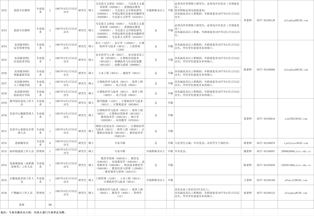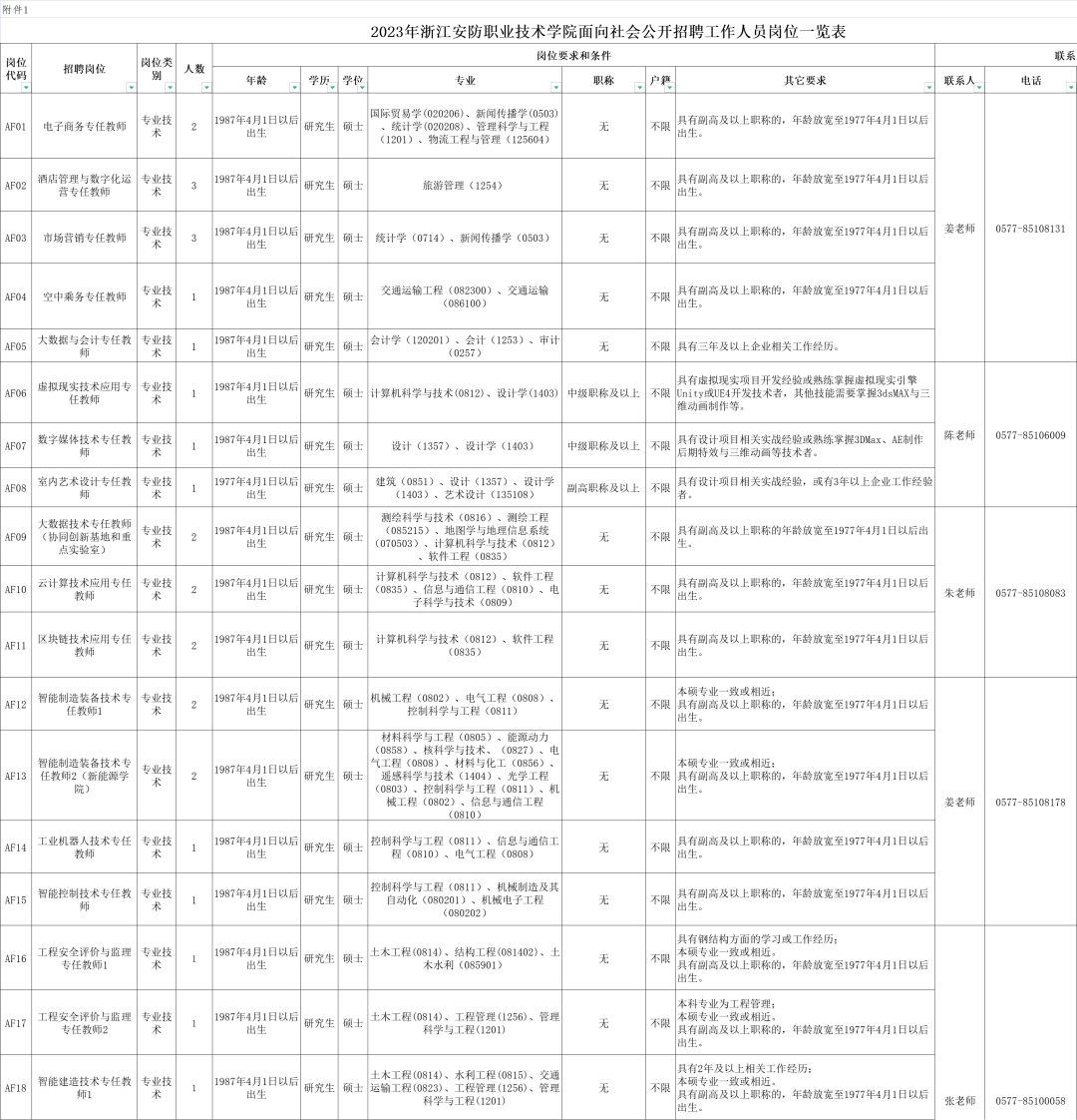 4.联系人和咨询电话:详见附件1《2023年浙江安防职业技术学院面向社会公开招聘工作人员岗位一览表》。