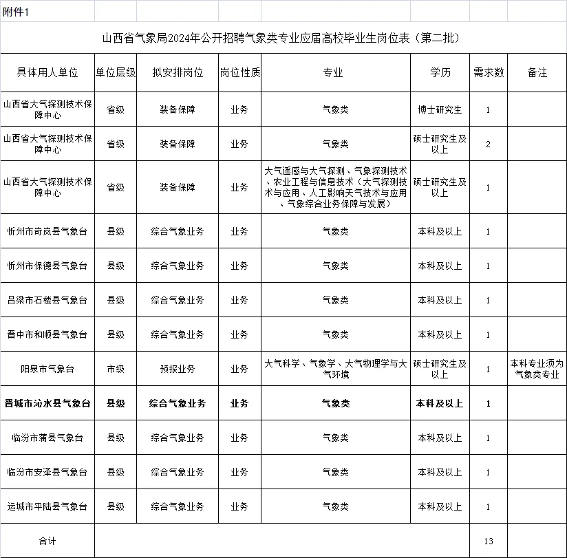 因气象事业发展需要,山西省气象部门急需补充气象类专业人才,根据中国气象局批复的山西省气象局2024年度事业单位招聘计划,按照《事业单位公开招聘人员暂行规定》《气象部门事业单位公开招聘人员管理办法》《山西气象部门事业单位公开招聘应届高校毕业生实施办法(试行)》等相关规定精神,山西省气象局决定为部分事业单位公开招聘气象类专业应届高校毕业生。现就有关事项公告如下:山西省国家气象部门各级管理机构实行上级气象主管机构与本级人民政府双重领导,以上级气象主管机构领导为主的管理体制,在上级气象主管机构和本级人民政府领导下,根据授权承担本行政区域内气象工作的政府行政管理职能,依法履行气象主管机构的各项职责。山西省气象局下设10个内设机构,9个直属事业单位,2个地方事业单位。全省气象部门设11个市级气象局和110个县级气象局(站)。具体招聘岗位及范围详见附件1:《山西省气象局2024年公开招聘气象类专业应届高校毕业生岗位表(第二批)》。招聘聘用人员为山西省气象部门事业单位工作人员,按规定享受相应工资福利待遇。1.拥护中国共产党,拥护社会主义,热爱气象事业,具有中华人民共和国国籍。2.本科、研究生毕业生年龄在30周岁以下(1993年4月1日以后出生),博士毕业生年龄在40周岁以下(1983年4月1日以后出生)。3.遵纪守法,品行端正,无违法、违纪行为,愿意履行事业单位人员的义务。5.2024年大学本科及以上普通高校毕业生或2022年、2023年毕业后未落实工作单位,其户口、档案、组织关系仍保留在原毕业学校,或保留在各级毕业生就业主管部门(毕业生就业指导服务中心)、各级人才交流服务机构和各级公共服务机构的毕业生。6.符合岗位的学历、专业要求和岗位所需的其他条件;专业根据中国气象局人事司《气象部门人员招录专业目录(2024年版)》认定。7.毕业报到时需同时具备岗位要求的学历毕业证、学位证和其它相关手续证明。3.按照《事业单位公开招聘人员暂行规定》(人事部令第6号)和相关规定应当回避的。4.与具体用人单位(科级单位)工作人员有夫妻关系、直系血亲关系、三代以内旁系血亲或者近姻亲关系的,不得报考该用人单位。通过中国气象局网站(www.cma.gov.cn)、山西省气象局网站(sx.cma.gov.cn)以及气象人才招聘网(zp.cmatec.cn)发布招聘公告。1.每位考生报名时可以按照第一志愿到第三志愿选择三个岗位,并且选择是否服从调剂。未注明是否服从调剂的视为不同意调剂。考生所学专业及学历必须与所有志愿岗位要求的条件一致。2.本次招聘采取招聘系统和电子邮件报名相结合的方式。符合《山西省气象局2024年公开招聘气象类专业应届高校毕业生岗位表(第二批)》设定的专业、学历和学位等要求的毕业生,请注册气象人才招聘网进行报名。报名网络地址:气象人才招聘网(zp.cmatec.cn)。网上填报的同时,请填写《山西省气象局2024年公开招聘应届高校毕业生报名表》《山西省气象局2024年公开招聘应届高校毕业生报名登记表》,将两份表格电子版和本人近期1寸红底免冠电子照片发送至sxsqxjzp@163.com。邮件的主题名和报名表、登记表的文件名统一编写为“报考岗位(第一志愿)-姓名-学历-所学专业”,电子照片必须以“报考岗位(第一志愿)-姓名”为文件名称。报名信息以电子邮件内容为准。3.报名时间:2024年4月15日至2024年4月24日(报名截止时间为2024年4月24日18:00)。山西省气象局按照招聘公告中明确的条件对报名人员进行资格初审,报名信息与所报岗位资格条件不符的、所学专业与用人单位岗位需求不符的,取消应聘资格。审核通过后,将在山西省气象局网站公布资格初审合格人员名单及面试公告。通过资格初审后未按要求参加后续程序的人员视为自动放弃面试资格。面试前还将对考生进行资格复审。考生必须使用同一有效居民身份证进行报名和参加考试。报名信息必须真实准确,如有不实、弄虚作假,一经核实将取消资格。对伪造有关证件、材料骗取应聘资格的,将按有关规定予以严肃处理。资格审查工作贯穿于公开招聘的全过程,凡发现报考者与招聘岗位所要求的资格条件不符以及提供虚假材料的,随时取消其考试、聘用资格。1.考试采取面试的方式进行,面试不设比例,通过资格审查的人员均参加面试。3.面试成绩即为总成绩。考生面试成绩须达到面试合格分数线方可进入考察和体检,面试合格分数线为60分。4.面试时间待定,具体时间、地点以山西省气象局网站公布的面试公告为准。1.进入考察和体检人员在达到面试合格分数线的考生中,按以下顺序确定:(1)每个岗位进入考察和体检人员按照第一志愿报考该岗位的考生面试成绩从高分到低分按岗位计划招聘人数1:1的比例确定。(2)第一志愿无人报考的岗位,在按照第(1)条确定考察和体检人员后未进入考察和体检人员名单且第二志愿报考该岗位的考生中,按照先研究生学历后大学本科学历的顺序,根据面试成绩从高到低,按岗位计划招聘人数1:1的比例确定进入考察和体检人员。(3)第一志愿和第二志愿均无人报考的岗位,在按照第(1)、(2)条确定考察和体检人员后未进入考察和体检人员名单且第三志愿报考该岗位的考生中,按照先研究生学历后大学本科学历的顺序,根据面试成绩从高到低,按岗位计划招聘人数1:1的比例确定进入考察和体检人员。(4