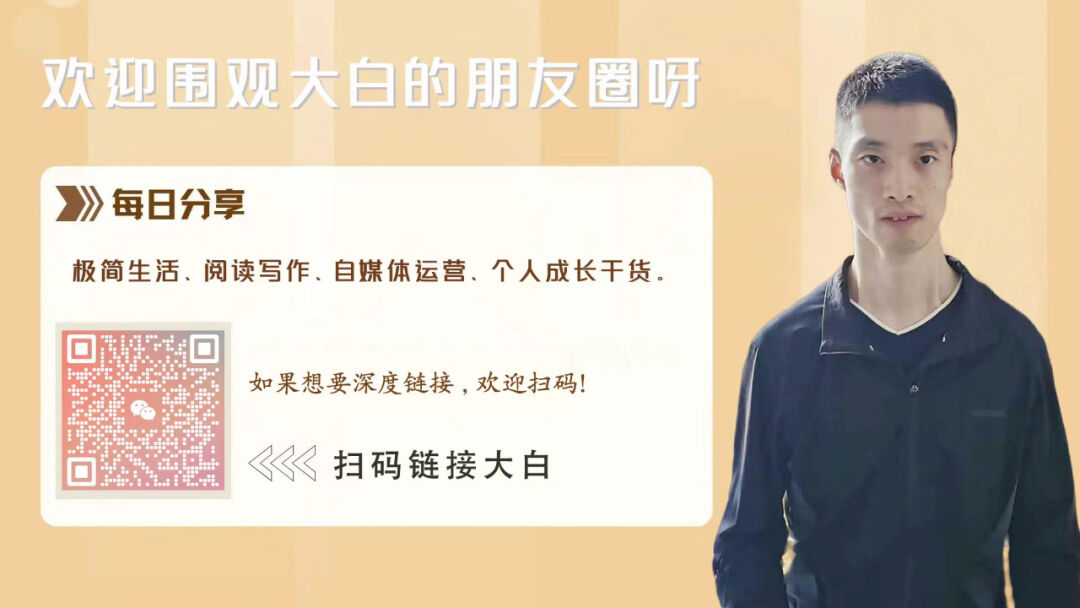 我是大白,95后自由撰稿人。曾因医生失误躺平25载,如今通过自媒体重获新生。持续分享极简生活、阅读写作、自媒体运营、个人成长干货。感谢你的关注。