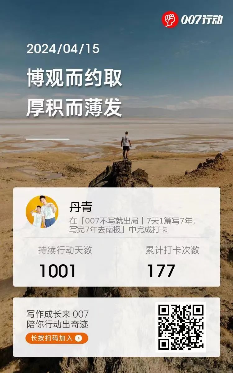 如果你想和丹青一样,用文字记录更多美好,传递更多能量,欢迎扫码加入007行动不写就出局。