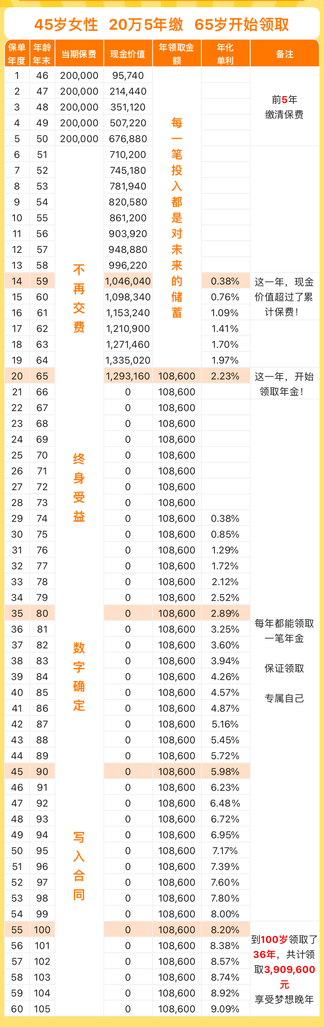 由于现金价值是持续到终身,所以不管什么时候离世,都能给家人留下一笔不少的财富,怎么看都是赚的。