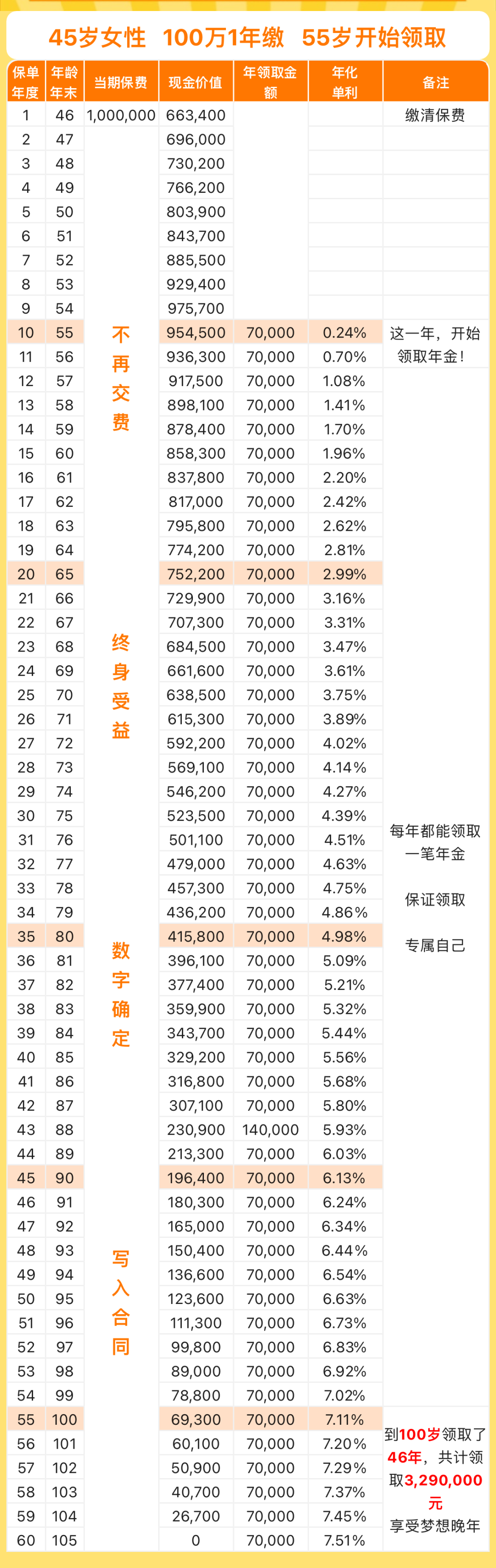 45岁的女客户,想55岁就开始领养老金,比较在意现金流和生存时拿到的收益,又考虑到后面可能会需要请护理,希望65岁开始能领取更高,不给子女增添负担,如果晚年能有一笔资金用来财富传承就更好了。