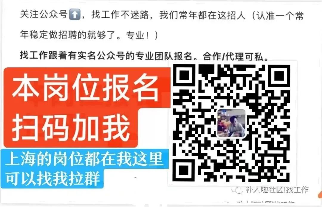 我们的岗位资源很多,也可以先加着备用,优秀的人可以帮你内推更好的工作。上海的好工作资源和缺人消息,我第一时间抢先发布,帮你对接给人事联系。免费直招。