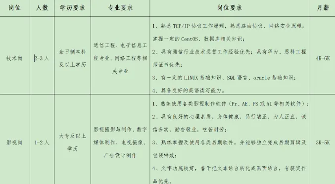 序号 | 职位 | 人数 | 资格条件 | 工作内容 |