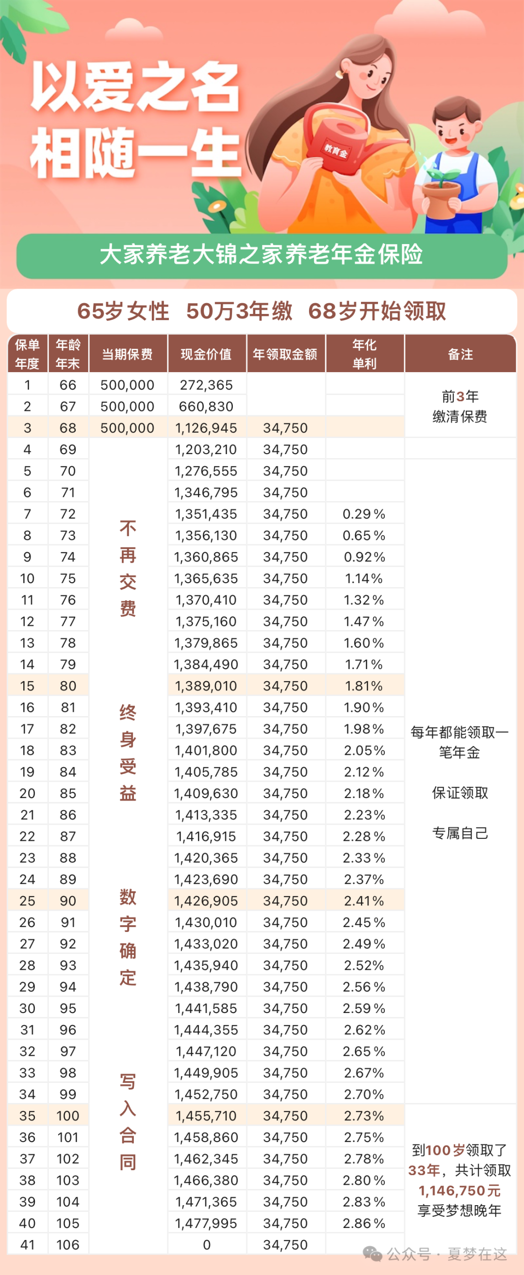 每年领取34750元的养老金,平均一个月2895元,活到老领到老,与人的生命等长,身故了还能拿回本金。