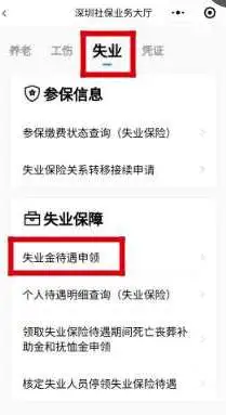 关注“深圳社保”或“深圳人社”微信公众号-→便民服务-→个人业务办理-→待遇申领-→失业保险金申请