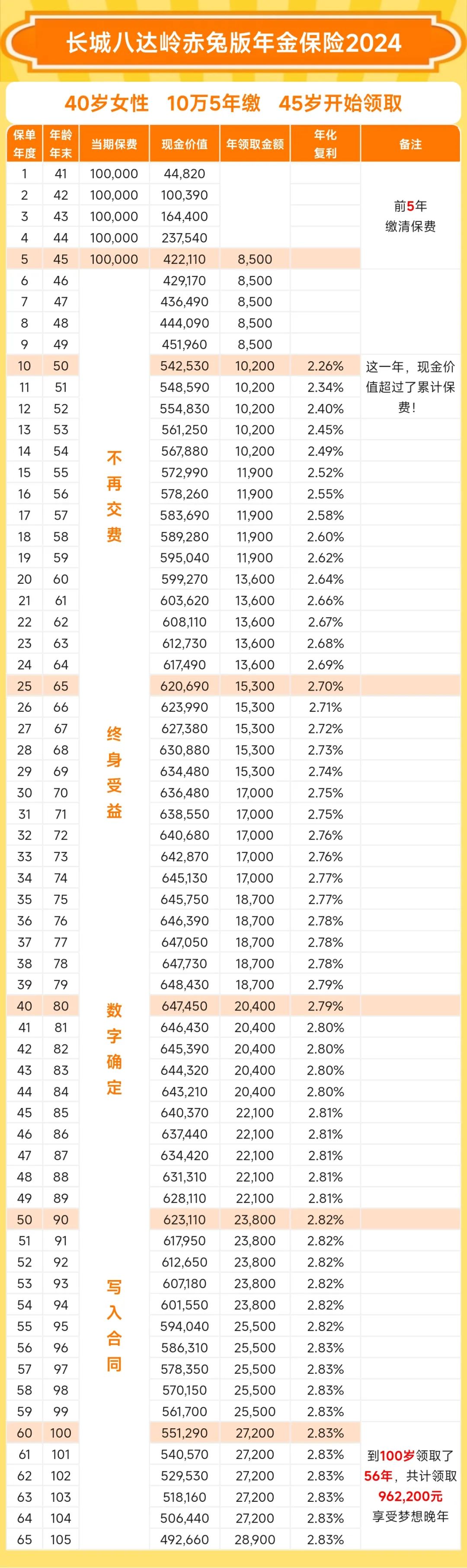 以40岁女性为例,年交10万×5年,共50万,选择增长计划,50岁现金超过所交保费,45岁开始领取,越领越多,头5年每年领8500元,后面都是递增领取1万以上,到100岁共领取96万左右。