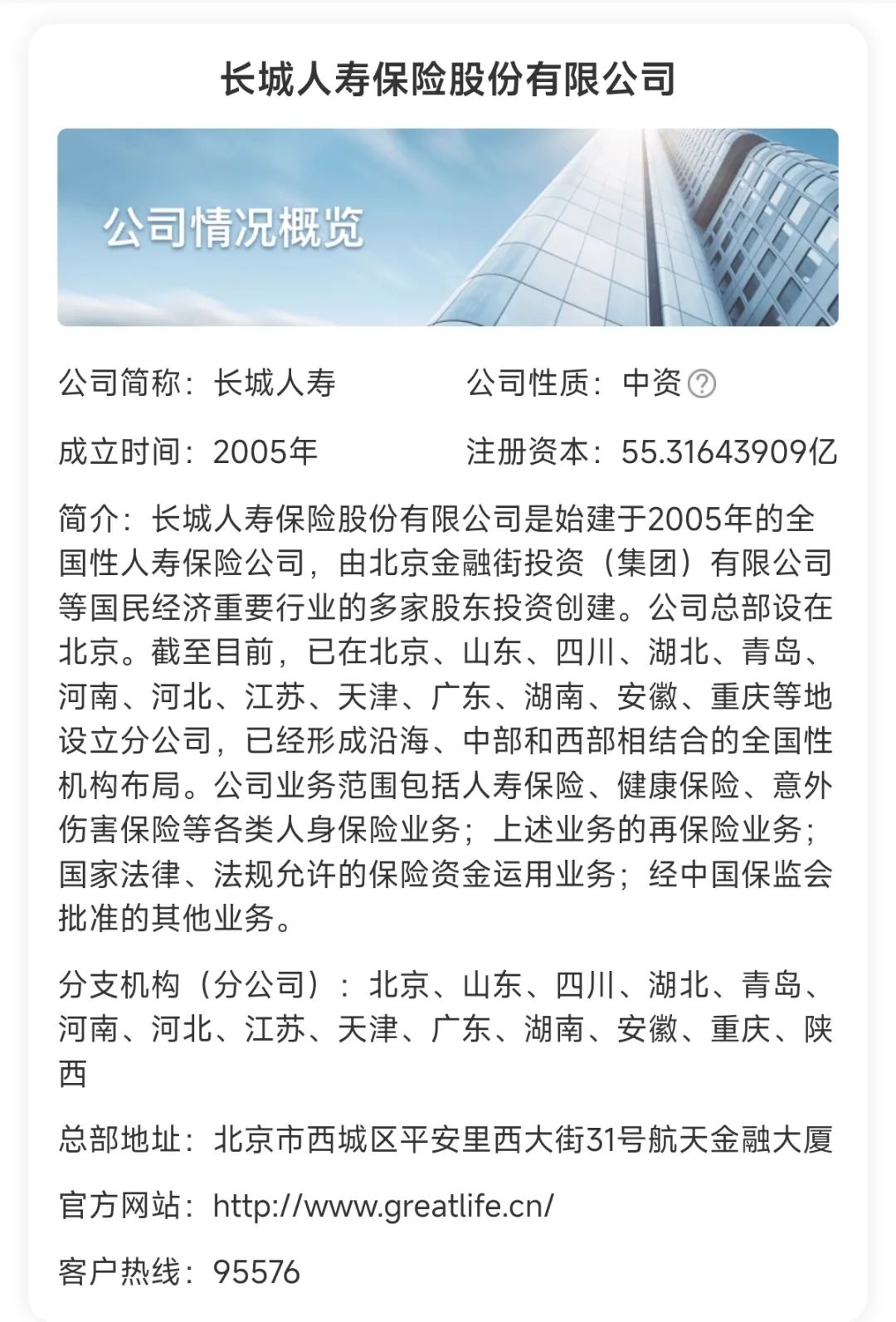 长城人寿是一家国企,实力雄厚,基本各地都有分支机构。