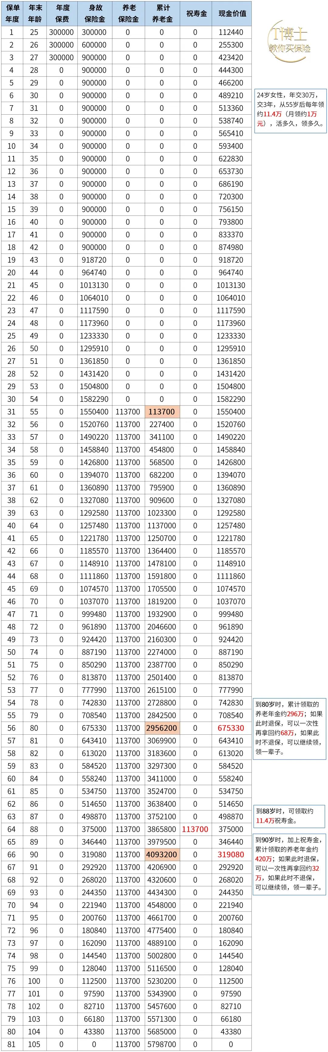 做父母的,总是会为孩子的长远做打算,希望给孩子更多支持。会有这个感慨,是因为最近有好多五六十岁客户给小孩买养老年金。为什么这些客户要给孩子买?今天我给大家分享一下这些客户考虑的点。这一代孩子,经历了教育内卷,好不容易出了社会又要经历职场内卷,还可能找不到工作。这背后,是整个经济周期的变化,经济增长放缓,开启下行周期。在经济高速增长时,父辈享受了时代红利,财富得以迅速增长。到了90乃至00后,时代红利点已经越来越少,且参与门槛越来越高。有位客户,这样和我们表达了对孩子的担忧,孩子从小到大学习成绩优异,还是211大学的毕业生。但毕业之后找工作就有些不顺,2年内前后换了3、4份工作。为了打破就业的种种桎梏,最近孩子还和他们提起了创业的计划。父母深知,自家孩子从小优秀、要强,自己给自己的压力、还有工作上的压力肯定不小。孩子是好孩子,就是当下经济环境大不如前,不忍心看着孩子被各种压力压得喘不过气。他们这一辈,享受了时代红利,挣到了不少财富。现在有余力,就想为孩子提前准备养老金,保证孩子老后生活的物质条件。从不指望孩子养老,到给孩子准备养老钱,父母,给孩子最好的礼物,无非就是能够为孩子扛住点什么。这是一位客户的原话。这些前来给孩子咨询的客户,不少是在体制内、国企上班的60、70一辈,他们光靠领社保退休金就能生活的挺好。而未来下一代能享受到的退休金待遇,可能不及父辈们的一半。此前就有篇爆火的文章讲述了自己工作4年,发现薪资条件还不如父母的退休金。这两年来,延迟退休的风吹了又吹,到我们孩子这一代,可能要推迟到70岁、80岁才能退休。参照隔壁的日本,太多人七老八十还在打工,由于年轻时没有提前准备,到老后只能缩衣节食,甚至选择故意犯罪到监狱养老。除了延迟退休以外,眼下我国人口老龄化趋势愈发严峻,社保养老金也面临挑战《中国养老金精算报告2019-2050》提到,社保养老金将在2028年出现赤字并不断扩大,到2050年,社保养老金可能达到负11.28万亿元。眼下我国还能做到40%左右的养老金替代率,随着退休人口迅速增多,出生人口减少,下一代光靠领社保养老金,可能很难有个体面的晚年。现在就给孩子备好养老钱,将来社保不够的部分,用养老年金来补充,可以让孩子有个比较充足的养老保障。如果希望给孩子配置养老年金的,我们推荐下面这款产品。首先,这款产品每年领取金额比较高,在市面上名列前茅。其次,产品现金价值伴随终身,需要用钱的时候,只要被保人活着,随时可以选择减保或者退保提取部分或者全部的现金价值。如果孩子一直没有退保,等到孩子百年以后,还可以把钱继续传给下一代,当做一种爱的延续。24岁女性,年交30万,交3年,从55岁后每年领约11.4万(月领约1万元),活多久,领多久。到80岁时,累计领取的养老年金约296万;如果此时退保,可以一次性再拿回约68万,如果此时不退保,可以继续领,领一辈子。到90岁时,加上祝寿金,累计领取的养老年金约420万;如果此时退保,可以一次性再拿回约32万,此时总利益(约452万)相当于总保费的5倍。