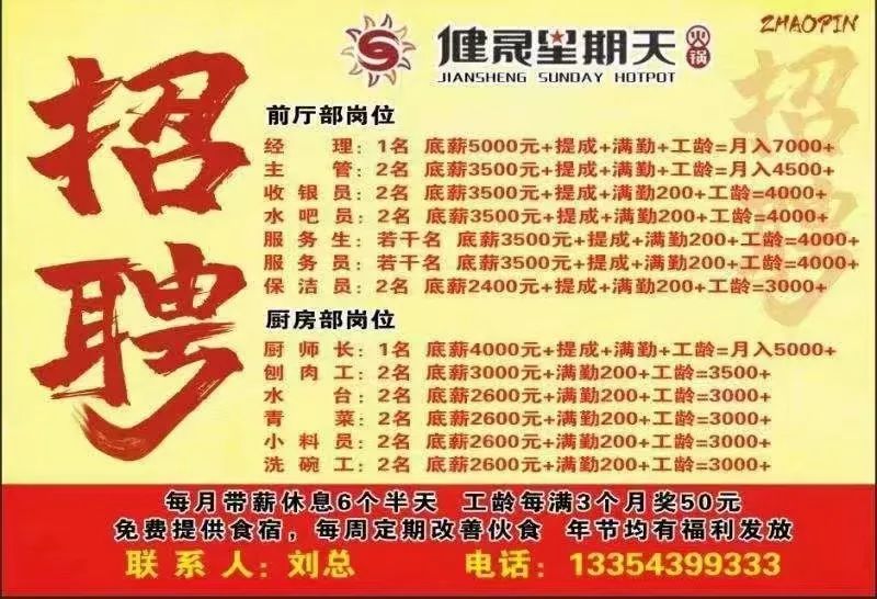 招聘前厅服务员,后厨。电话13704399152,另有长方形火锅桌面三张,便宜出售