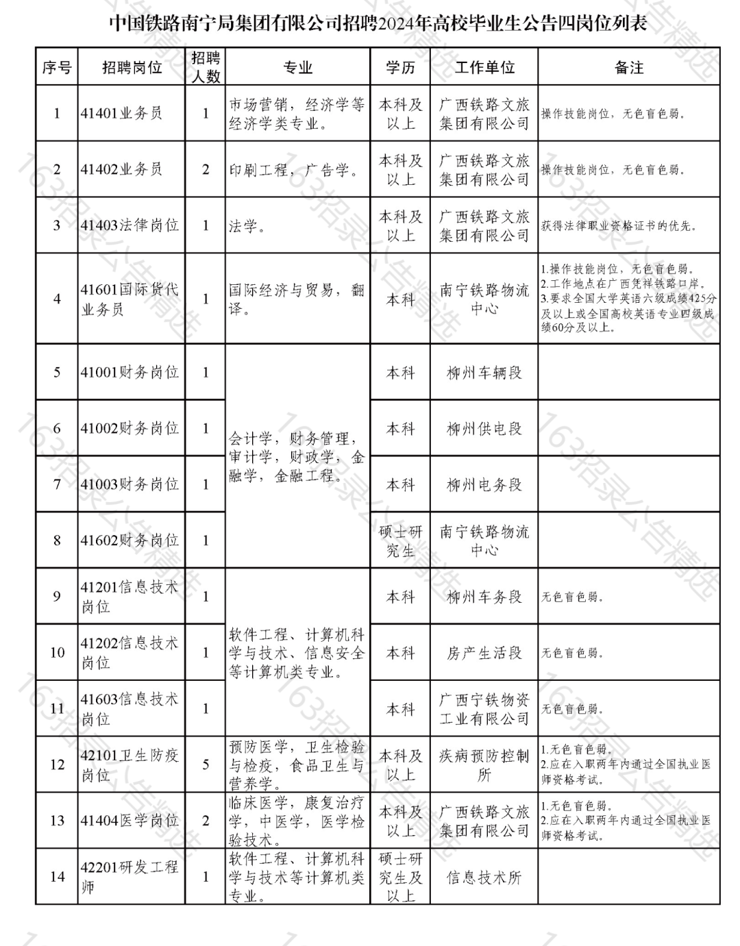 本次招聘岗位、专业、人数详见附件《中国铁路南宁局集团有限公司招聘2024年高校毕业生公告四岗位列表》。