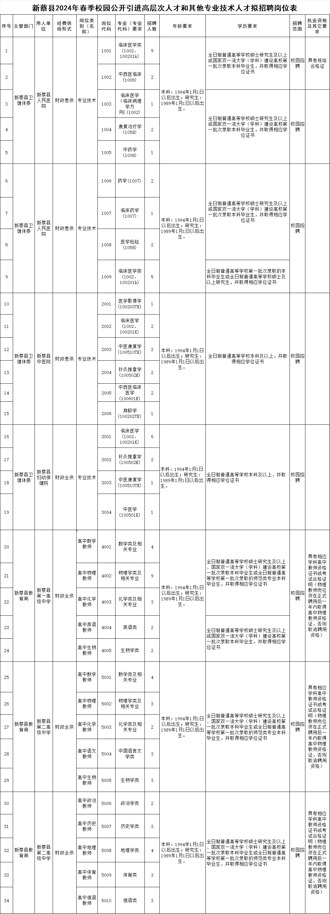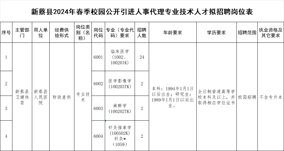 1.《新蔡县2024年春季校园公开引进高层次人才和其他专业技术人才拟招聘岗位表》