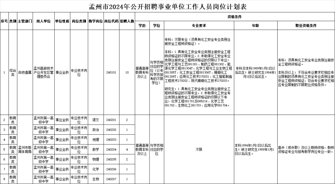 1.孟州市2024年公开招聘事业单位工作人员岗位计划表