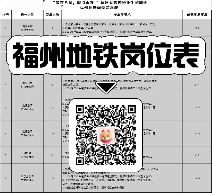 详见附件:《“就在八闽,职引未来”福建省高校毕业生招聘会(福州地铁岗位需求表)》.pdf