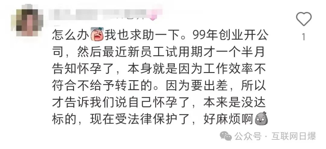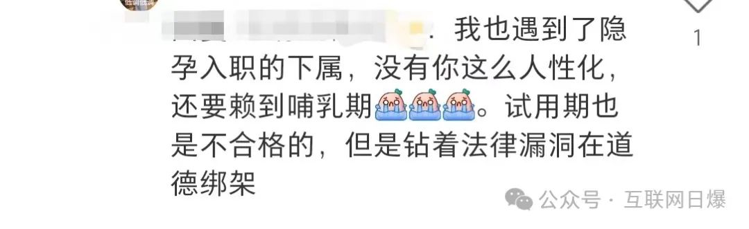 还有一位公司领导直言:我也遇到了隐孕入职的下属,而这位怀孕员工想到哺乳期才走,原本也是试用期不合格的,但是现在钻着法律漏洞在道德绑架。