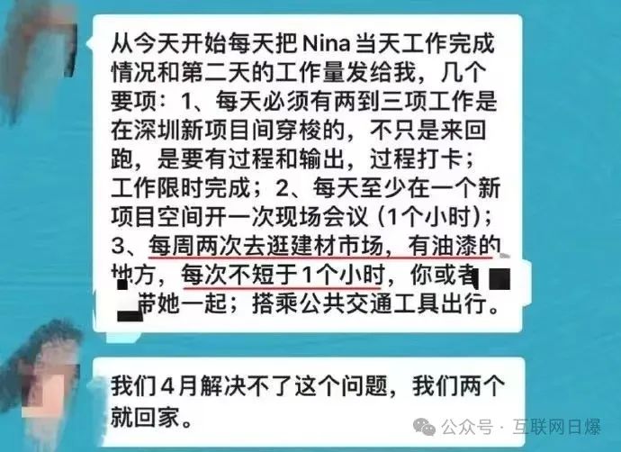 据这位网友透露,公司领导给这位怀孕员工制定了每天的工作计划,其中包括了几个要项:1、每天必须有两到三项工作是在深圳新项目间穿梭的,不只是来回跑,是要有过程和输出,过程打卡;工作限时完成;2、每天至少在一个新项目空间开一次现场会议(1个小时);3、每周两次去逛建材市场,有油漆的地方,每次不短于1个小时,还必须有人和她一起去,只允许搭乘公共交通工具出行。