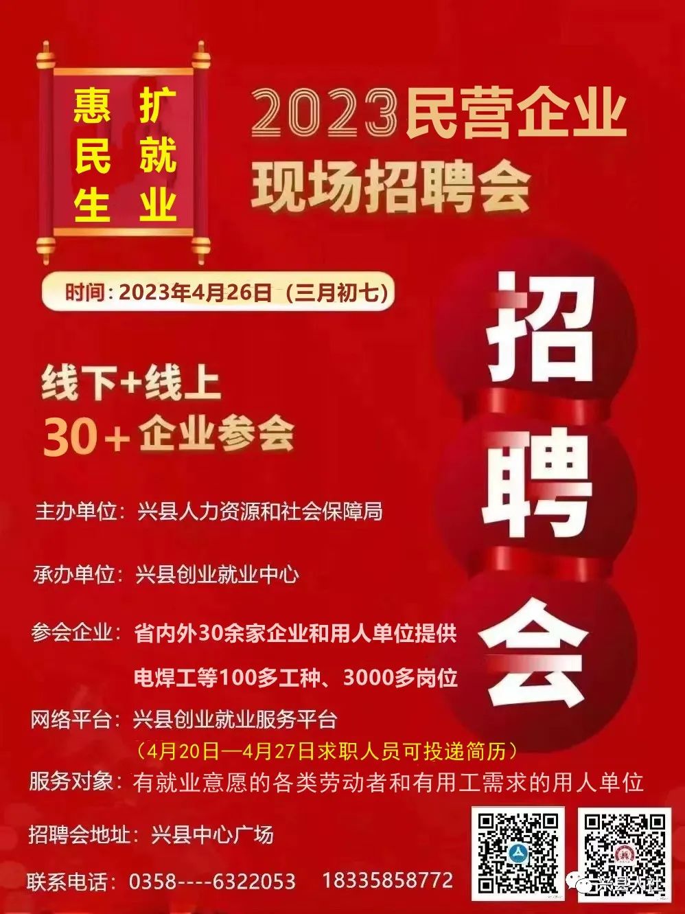 为深入学习党的二十大精神,贯彻落实党的二十大报告提出“实施就业优先战略、强化就业优先政策”的“双优先”工作部署,促进民营经济高质量发展,带动和扩大就业,根据《关于开展2023年民营企业服务月活动的通知》(晋人社厅函〔2023〕246号)文件精神,兴县人社局计划在“兴县创业就业服务平台”举办2023年民营企业线上招聘会,同时在兴县中心广场举办人社政策宣传暨民营企业现场招聘会。现将有关事项通知如下: